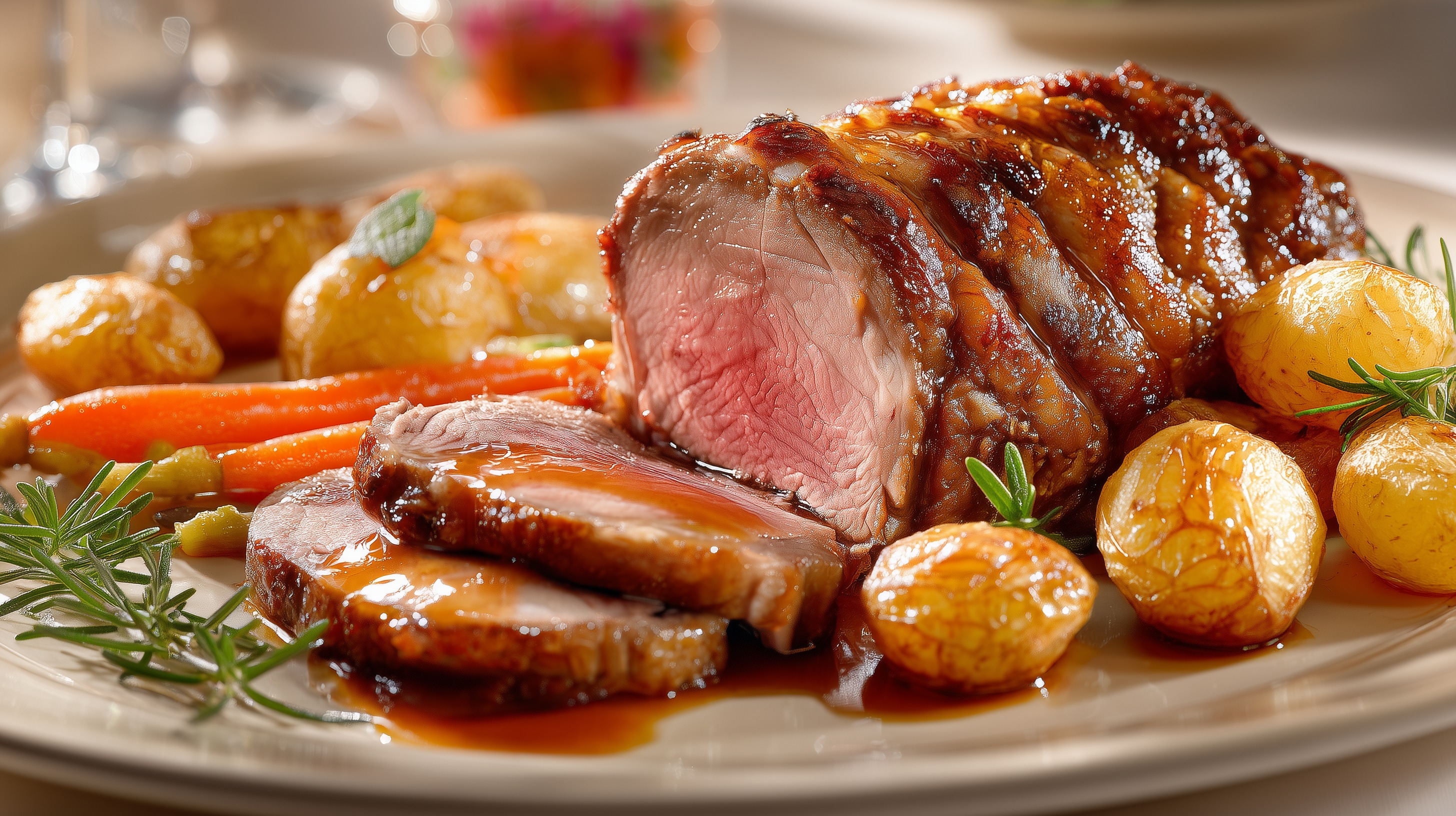 - Die Lammkeule in Scheiben aufschneiden, mit den Rosmarinkartoffeln und Karotten auf vorgewärmten Tellern anrichten und die Sauce darüber träufeln. Mit frischem Rosmarin garnieren.