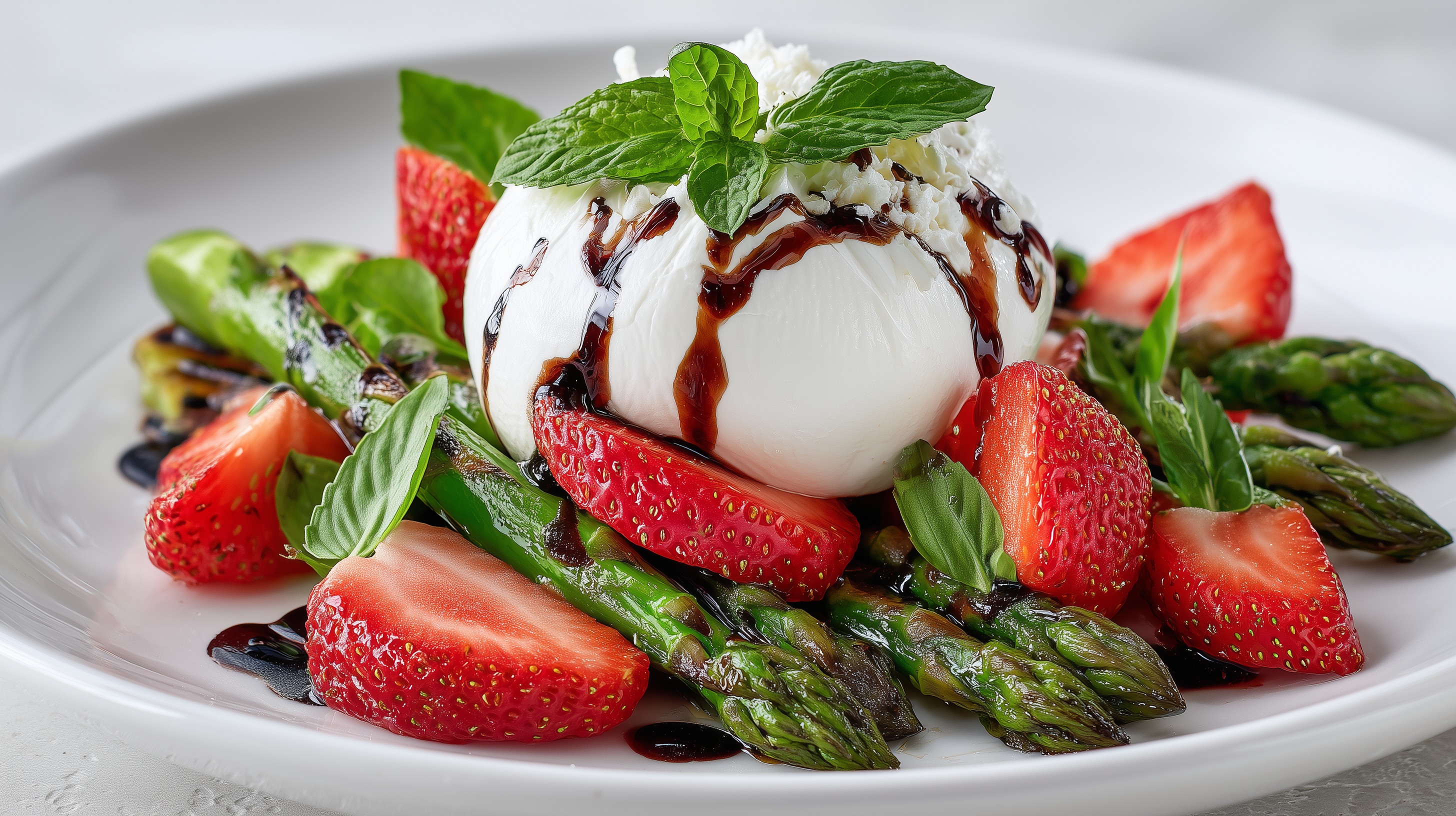 - Je eine Burrata-Kugel vorsichtig aus der Verpackung nehmen, abtropfen lassen und mittig auf das Spargel-Erdbeer-Bett setzen.