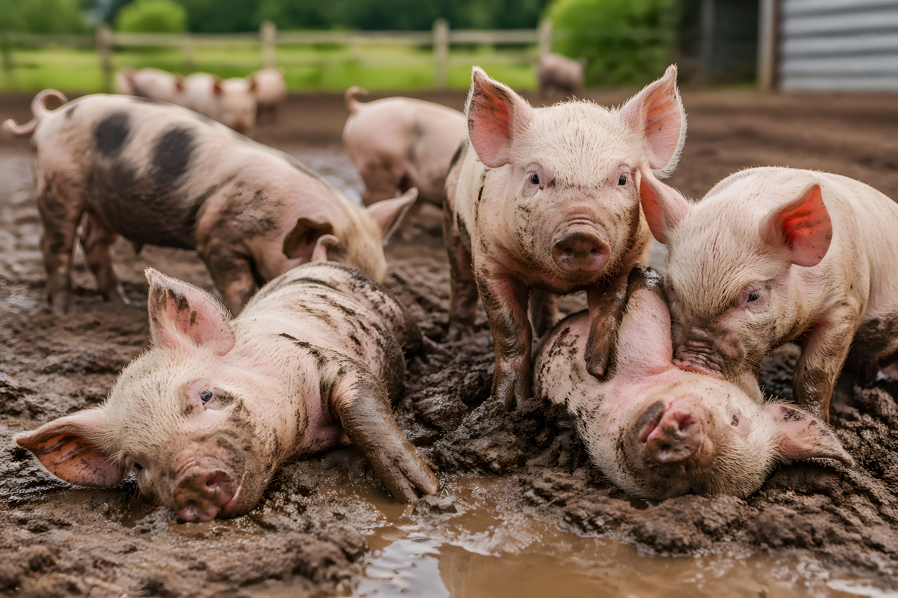 Dieses lebendige Foto zeigt eine Gruppe junger Schweine, die sich ausgelassen in einem Schlammbad auf einem Bauernhof wälzen. Im Vordergrund liegen zwei Ferkel entspannt im feuchten Matsch, während ein drittes aufrecht steht und neugierig in die Kamera blickt. Ein weiteres Tier ist rechts im Bild zu sehen, leicht von Schlamm bedeckt. Im Hintergrund sind weitere Schweine auf dem Gelände erkennbar, umgeben von einem Holzzaun und sattem Grün.