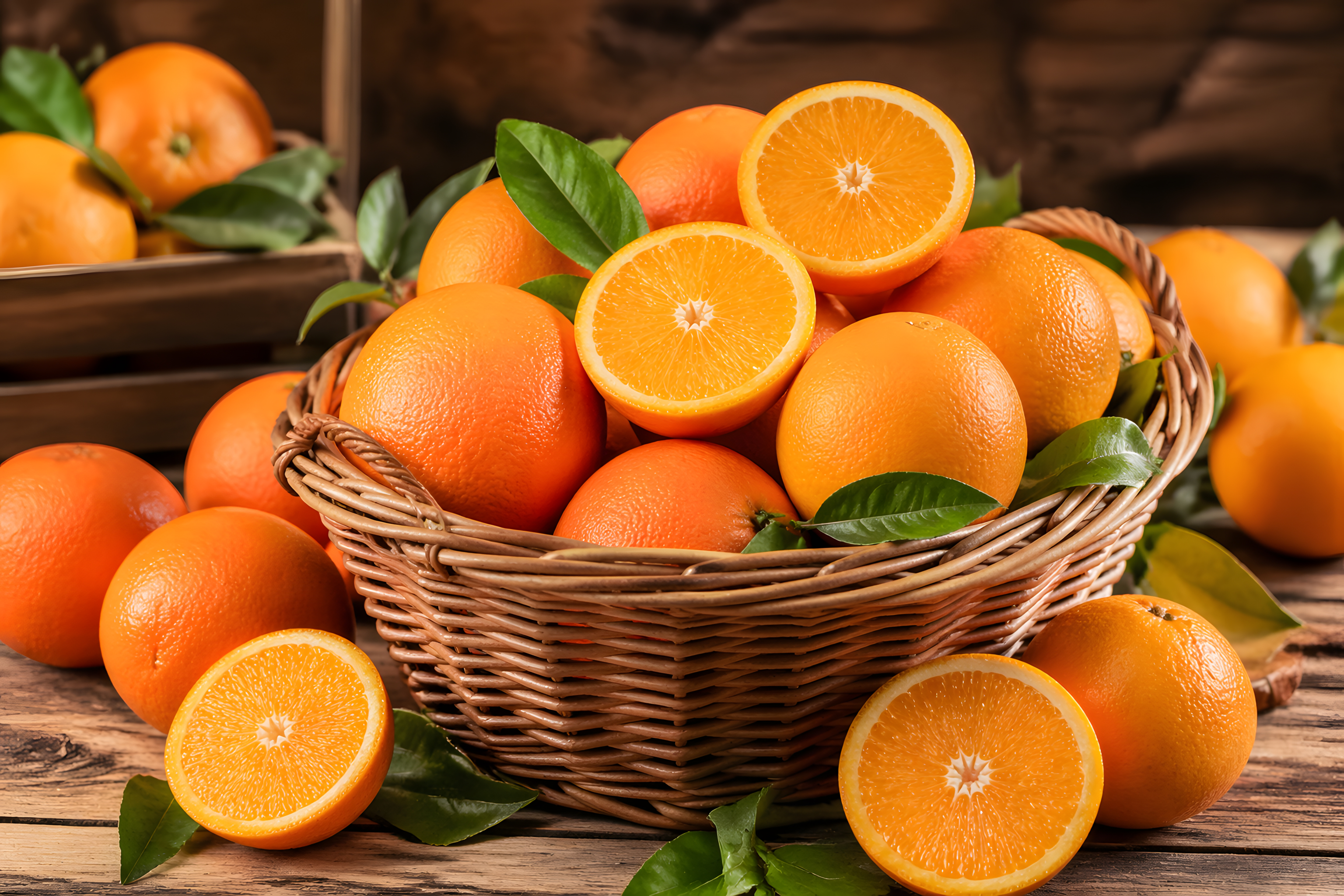 Grüne Blätter sind zwischen den Früchten verteilt und verleihen dem Bild einen natürlichen, frisch geernteten Charakter. Rund um den Korb liegen einzelne ganze und halbierte Orangen auf dem Holzuntergrund, was eine üppige, großzügige Atmosphäre erzeugt. Im Hintergrund ist eine Holzkiste mit weiteren Orangen zu erkennen, die die Tiefe des Bildes unterstreicht.