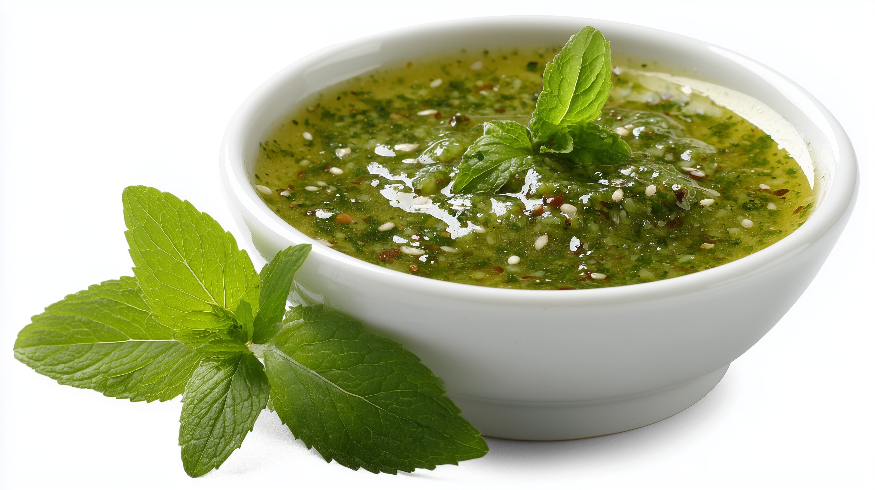 Diese Aufnahme zeigt eine weiße Keramikschale, gefüllt mit einer frischen grünen Kräutersauce, die mit Sesamkörnern, Gewürzflocken und einem Schuss Öl verfeinert wurde. Als Garnitur dienen frische Minzblätter, die sowohl auf der Sauce als auch neben der Schale arrangiert sind. Die leuchtend grüne Farbe der Sauce bildet einen starken visuellen Kontrast zur reinweißen Schale und zum weißen Hintergrund.