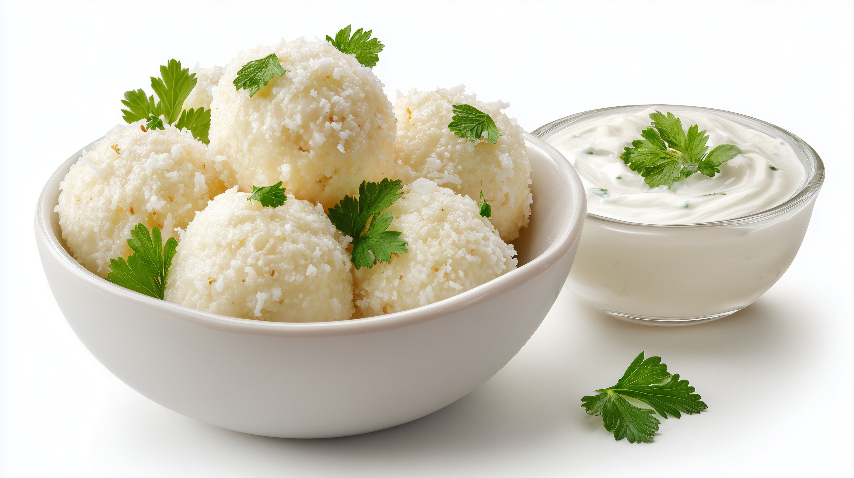 Dieses Stockfoto zeigt eine weiße Keramikschüssel gefüllt mit runden Reisbällchen, die mit feinen Körnern bedeckt sind und an Blumenkohlröschen erinnern. Die Bällchen sind mit frischen grünen Petersilienblättern dekoriert. Daneben steht ein kleines Glasschälchen mit einem cremig-weißen Joghurt-Dip, ebenfalls mit Petersilie garniert. Einzelne Kräuterblätter sind locker auf dem weißen Hintergrund verteilt.