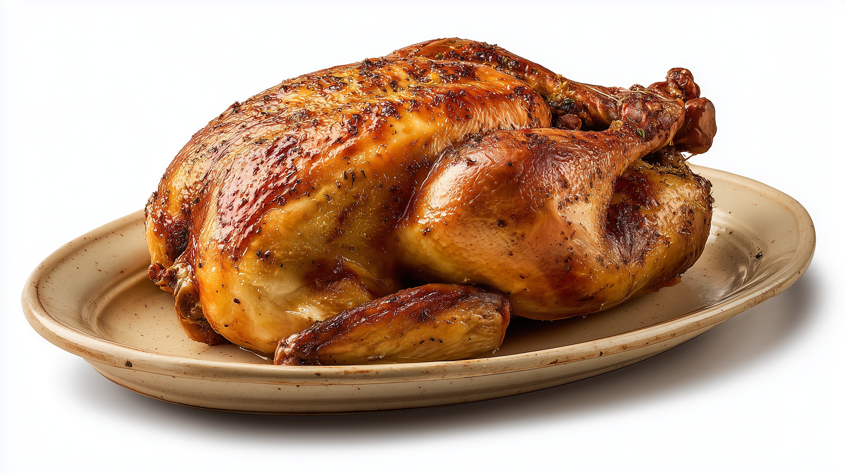Das Foto zeigt ein vollständig gebratenes Huhn mit goldbrauner, glänzender Kruste, das auf einem ovalen, beigen Servierteller liegt. Die Aufnahme erfolgte aus einer leicht schrägen Perspektive, die das ganze Gericht in seiner vollen Pracht zeigt. Die Haut des Hähnchens ist gleichmäßig gebräunt und weist dunkle Kräuter- und Gewürzspuren auf, was auf eine herzhafte Würzung hindeutet.