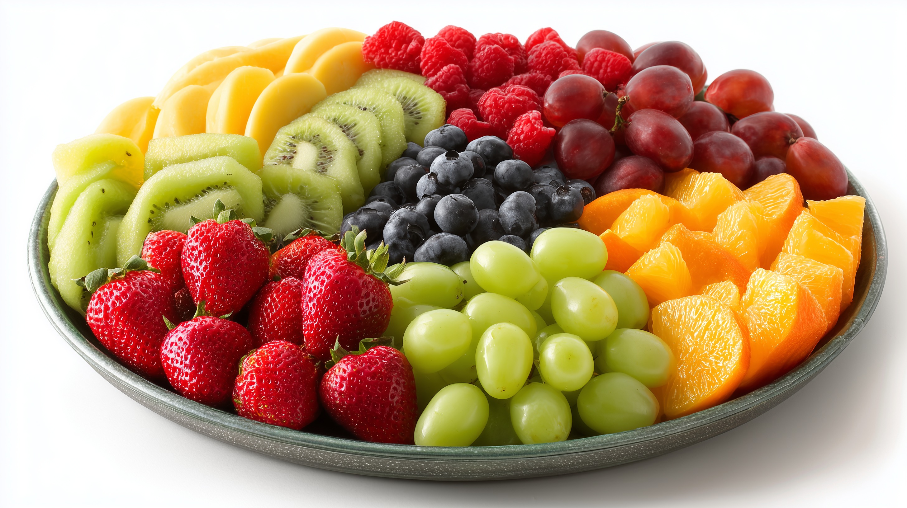 Diese Aufnahme zeigt eine üppig bestückte, runde Obstplatte auf einem schlichten grauen Tablett, freigestellt vor weißem Hintergrund. Die Früchte sind sorgfältig und farbenreich angeordnet: Geschnittene Kiwischeiben, rote Erdbeeren, dunkelblaue Blaubeeren, rote und grüne Weintrauben, Himbeeren sowie orangefarbene Mango- und Orangenstücke bilden ein harmonisches Farbspiel aus Rot, Grün, Blau, Gelb und Orange.