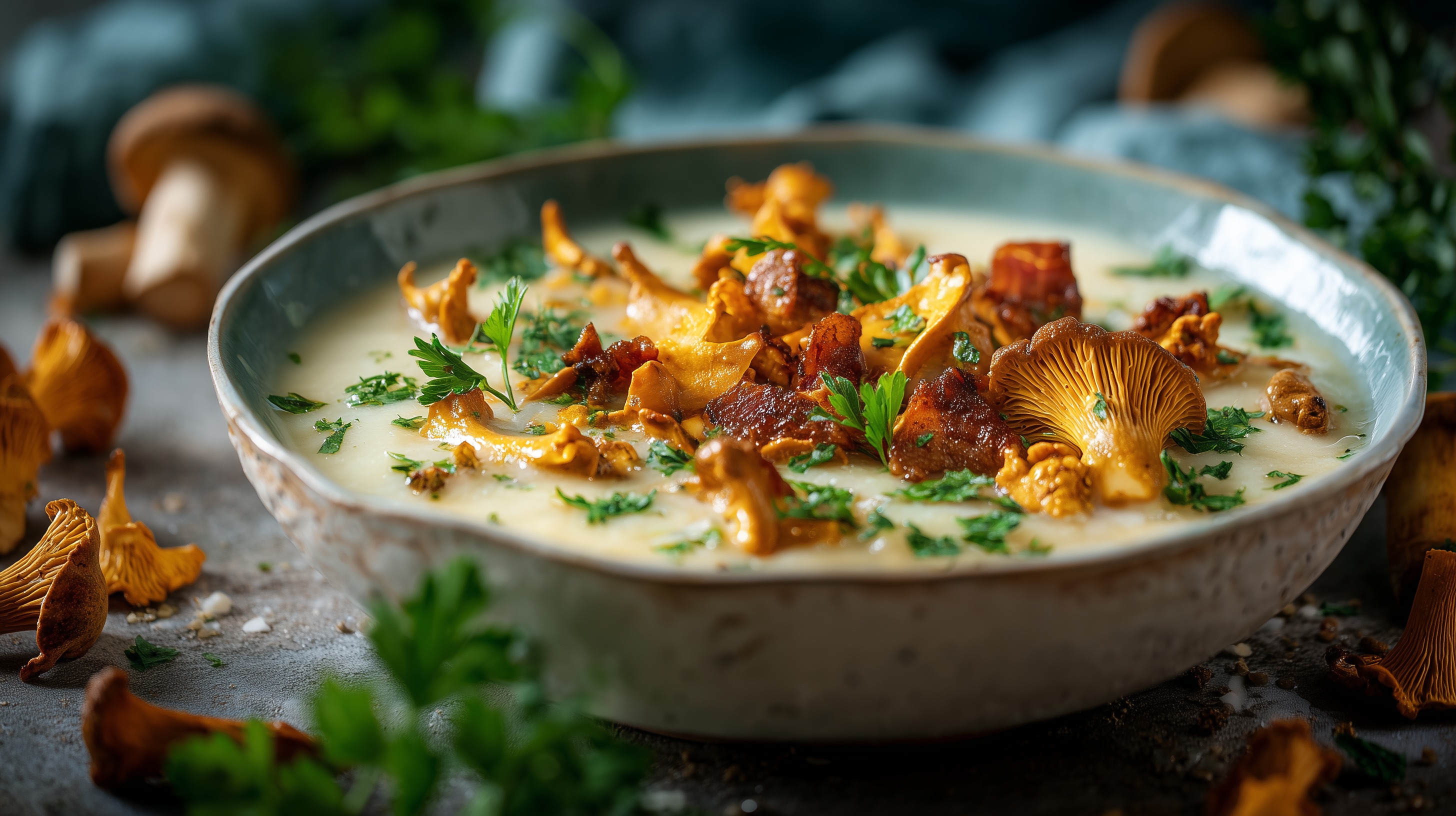 - Die Suppe in tiefen Tellern anrichten, großzügig mit den gebratenen Pfifferlingen und Speckwürfeln toppen und frisch gehackte Petersilie darüberstreuen. Sofort servieren.