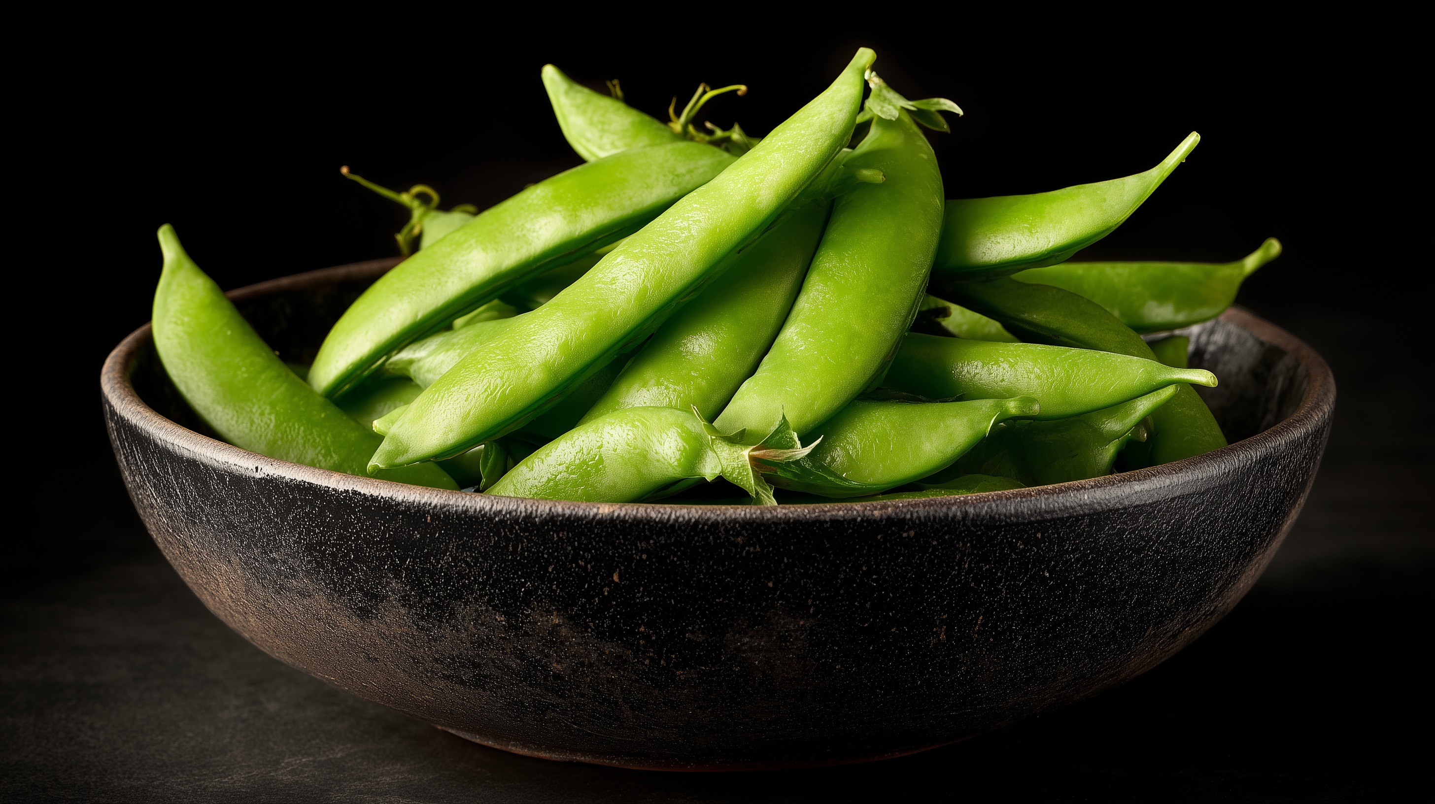 Dieses ausdrucksstarke Foto zeigt eine Handvoll frischer Zuckerschoten, die in einer dunklen, rustikalen Holzschale angeordnet sind. Die leuchtend grünen Schoten stechen eindrucksvoll vor dem tiefen schwarzen Hintergrund hervor und erzeugen einen starken Farbkontrast, der die natürliche Frische des Gemüses betont.