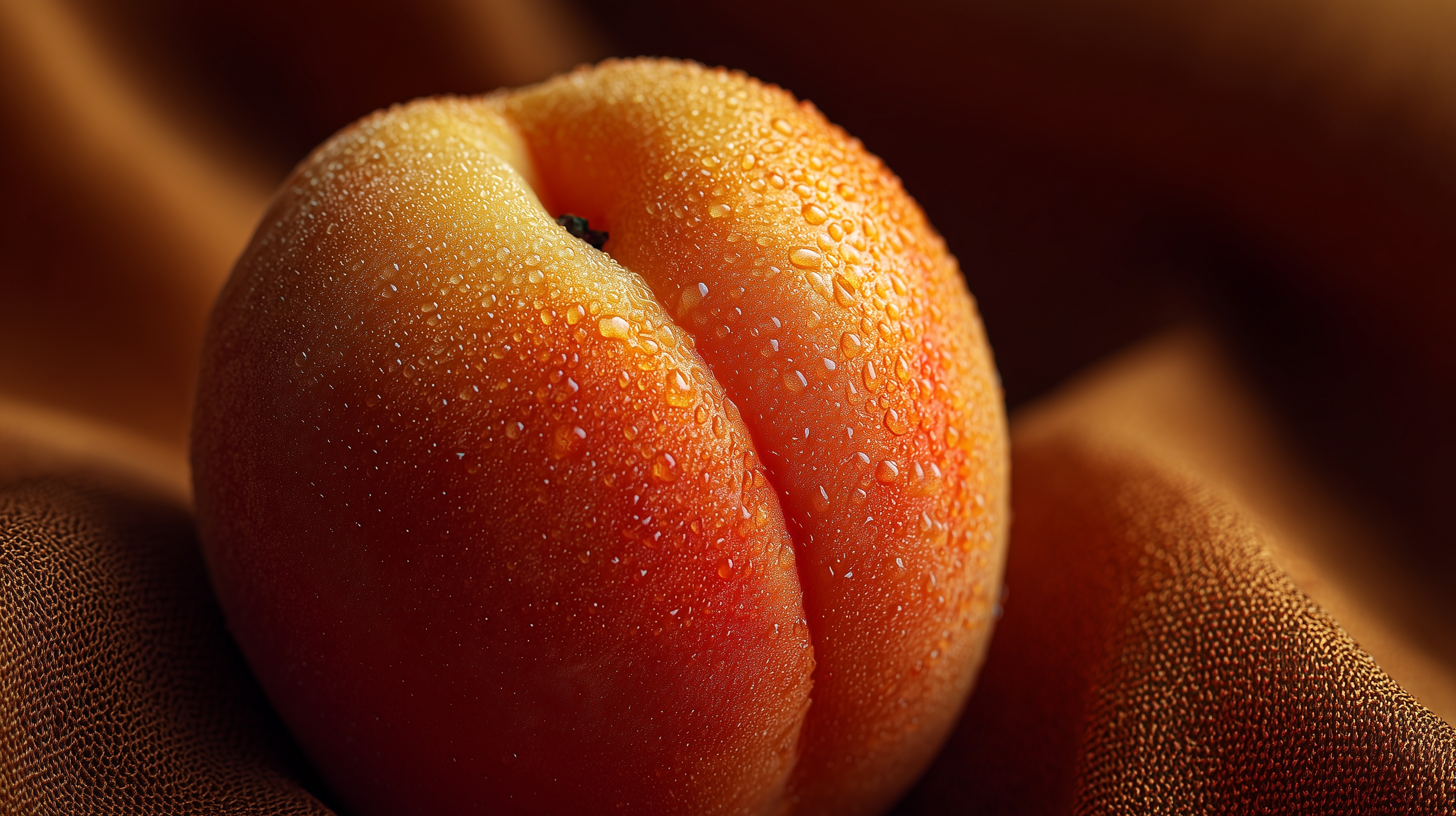 Diese beeindruckende Nahaufnahme zeigt eine reife Aprikose, die mit feinen Wassertropfen bedeckt ist. Die Frucht leuchtet in satten Orange- und Rottönen und liegt auf einem warmen, goldbraunen Stoffhintergrund, der die natürlichen Farben der Aprikose wunderbar unterstreicht.