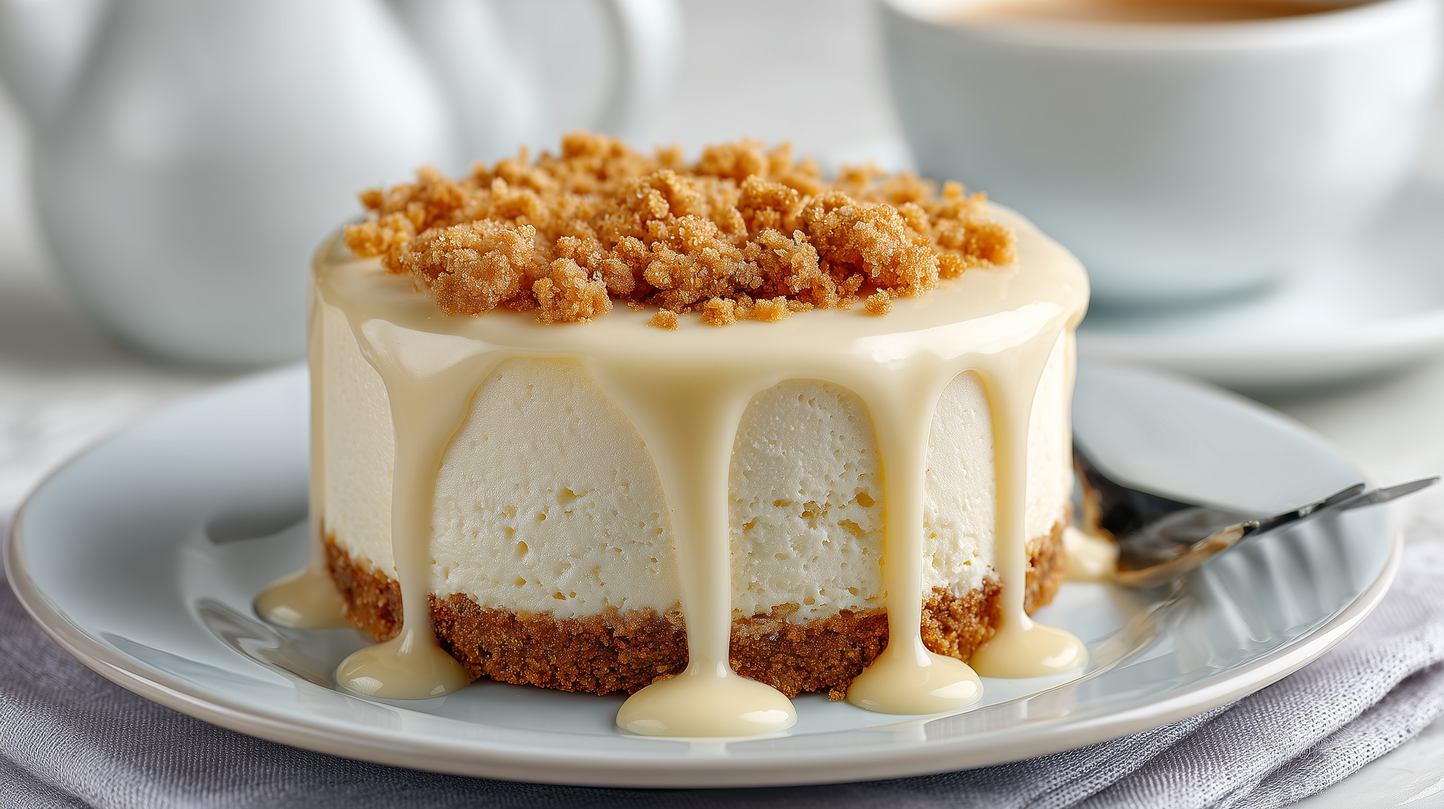 Dieses Stockfoto zeigt einen kunstvoll angerichteten Vanille-Käsekuchen in Einzelportionsgröße auf einem weißen Porzellaneller. Der Kuchen besticht durch seine cremig-weiße Füllung auf einem goldbraunen Keksboden und ist großzügig mit einer zart fließenden Vanilleglasur überzogen, die malerisch an den Seiten herunterläuft. Als krönender Abschluss ziert ein knuspriges Streusel-Topping die Oberseite.