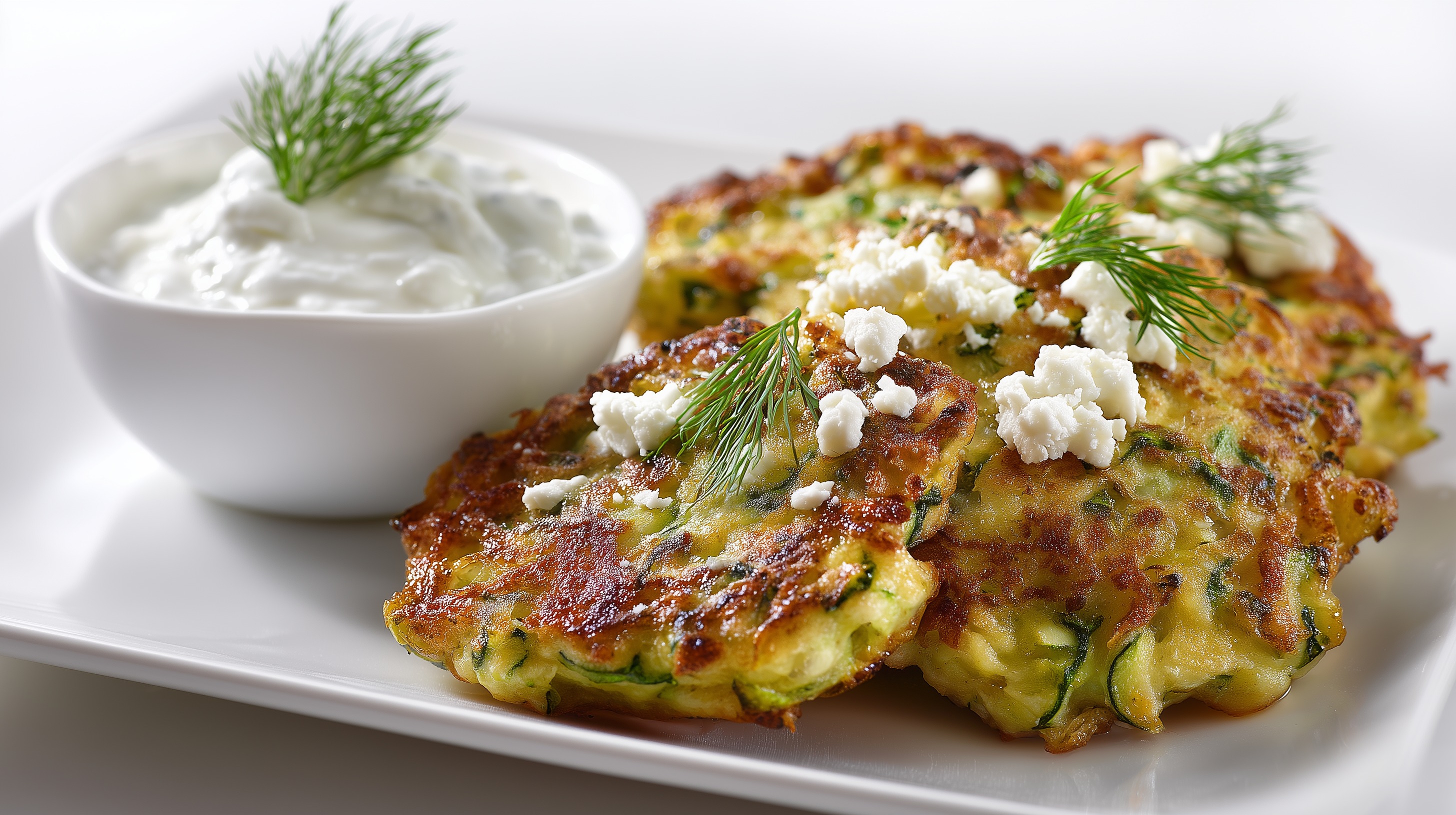 - Zucchini-Küchlein auf einem Teller anrichten, mit zerbröckeltem Feta und frischen Dillzweigen garnieren. Den Joghurtdip separat in einer kleinen Schale dazu servieren.