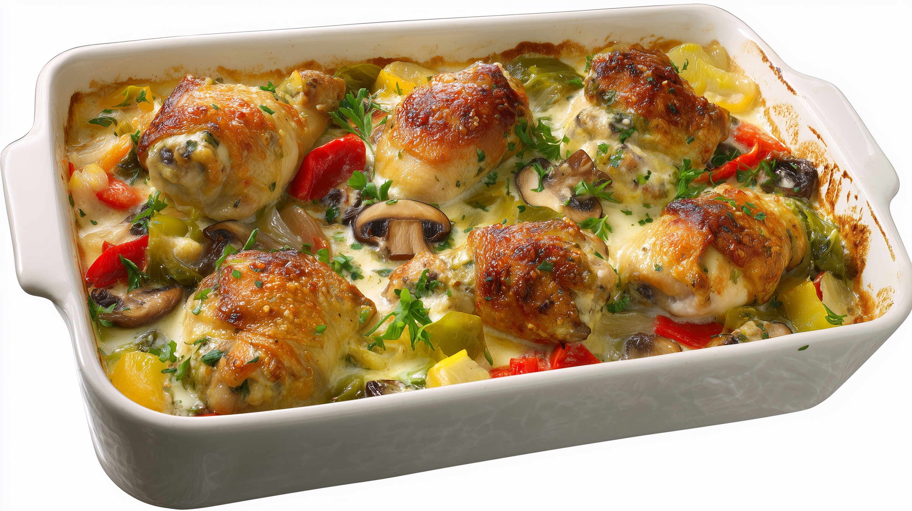 - Die Auflaufform in den vorgeheizten Ofen schieben und ca. 40–45 Minuten backen, bis die Hühnchenhaut schön goldbraun und knusprig ist und das Fleisch vollständig durchgegart ist (Kerntemperatur mind. 75 °C).