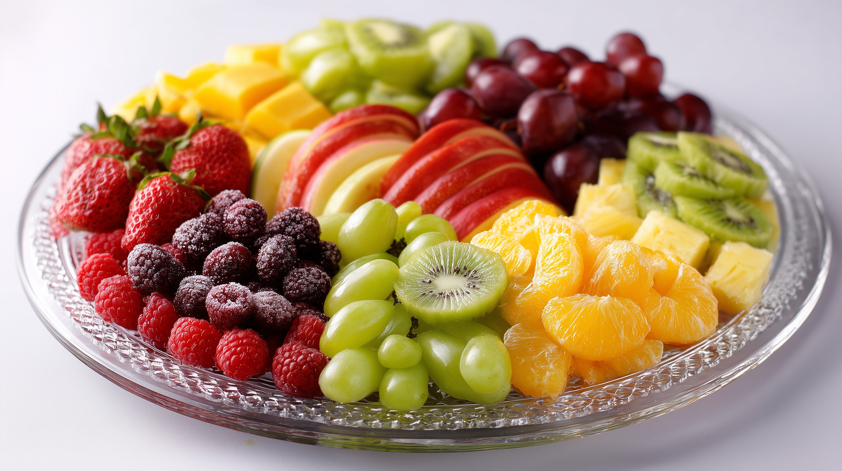 Diese ansprechende Fotografie zeigt eine großzügig bestückte Obstplatte auf einer runden Glasschale mit strukturiertem Rand. Die Früchte sind farbenfroh und ordentlich in Segmenten angeordnet, sodass ein harmonisches Muster aus Rot, Grün, Gelb und Orange entsteht.