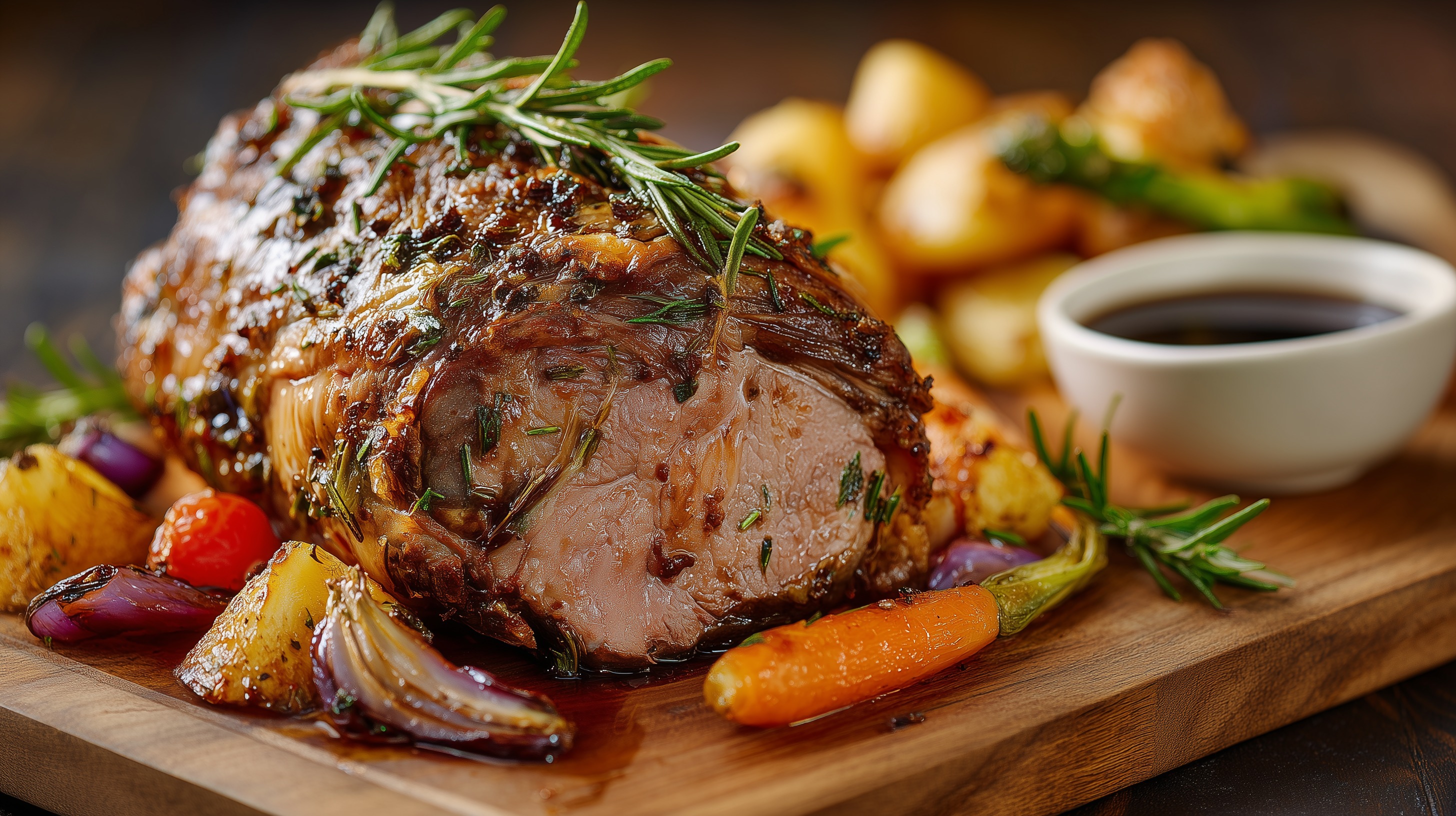 - Die Lammkeule auf einem Holzbrett mit dem Gemüse anrichten, mit frischem Rosmarin garnieren und die Sauce separat in einer kleinen Schüssel dazu reichen. Aufschneiden und sofort servieren.