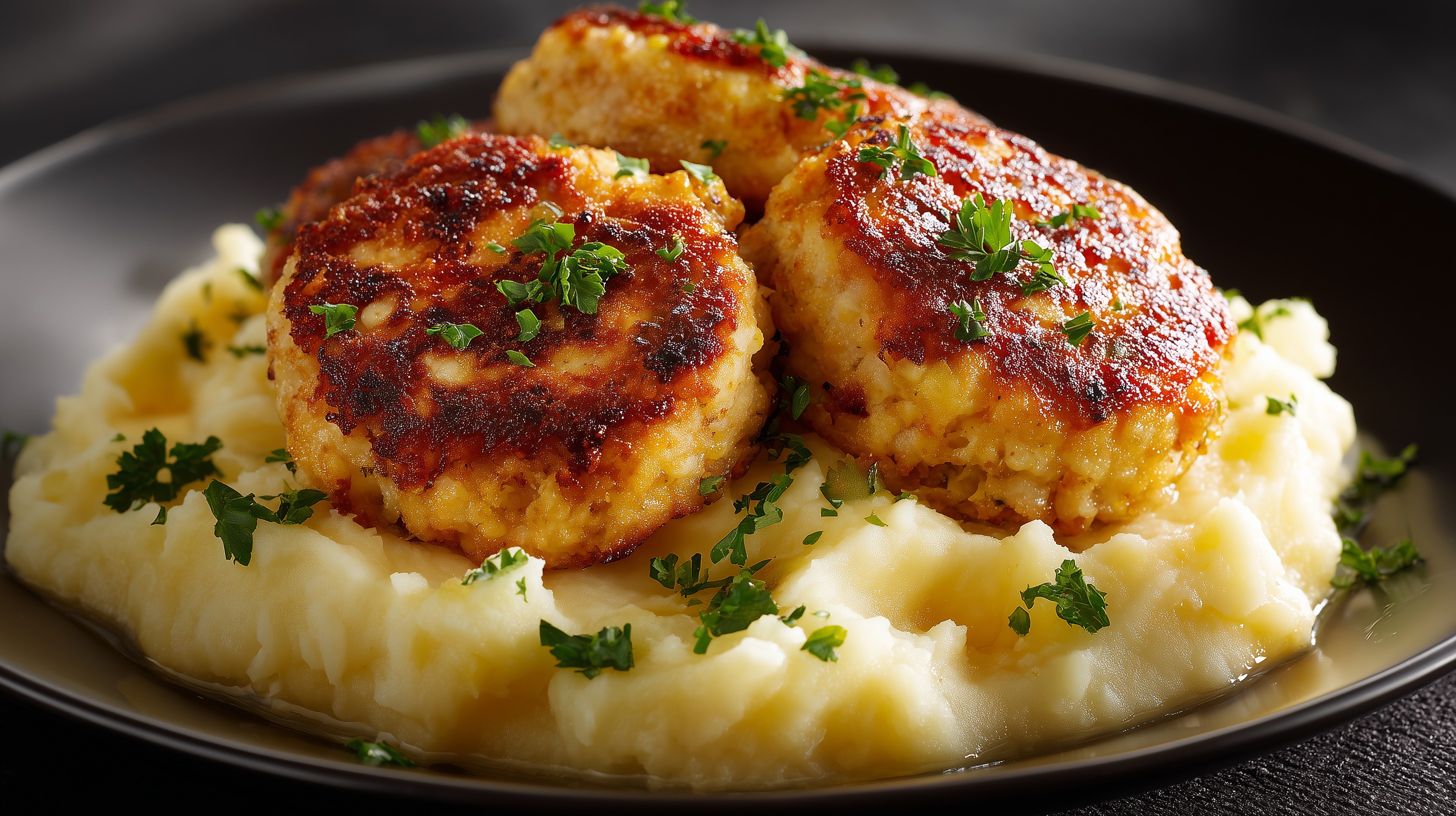 Dieses Foto zeigt drei goldbraun gebratene Frikadellen, die auf einem großzügigen Bett aus cremigem Kartoffelpüree angerichtet sind. Die Patties weisen eine intensive, karamellisierte Kruste in Rotbrauntönen auf und sind mit frisch gehackter Petersilie bestreut, die einen lebhaften grünen Akzent setzt. Das Gericht ist auf einem schlichten schwarzen Teller serviert, der die hellen Farben des Kartoffelpürees und die gebräunte Oberfläche der Fleischküchle besonders gut zur Geltung bringt.