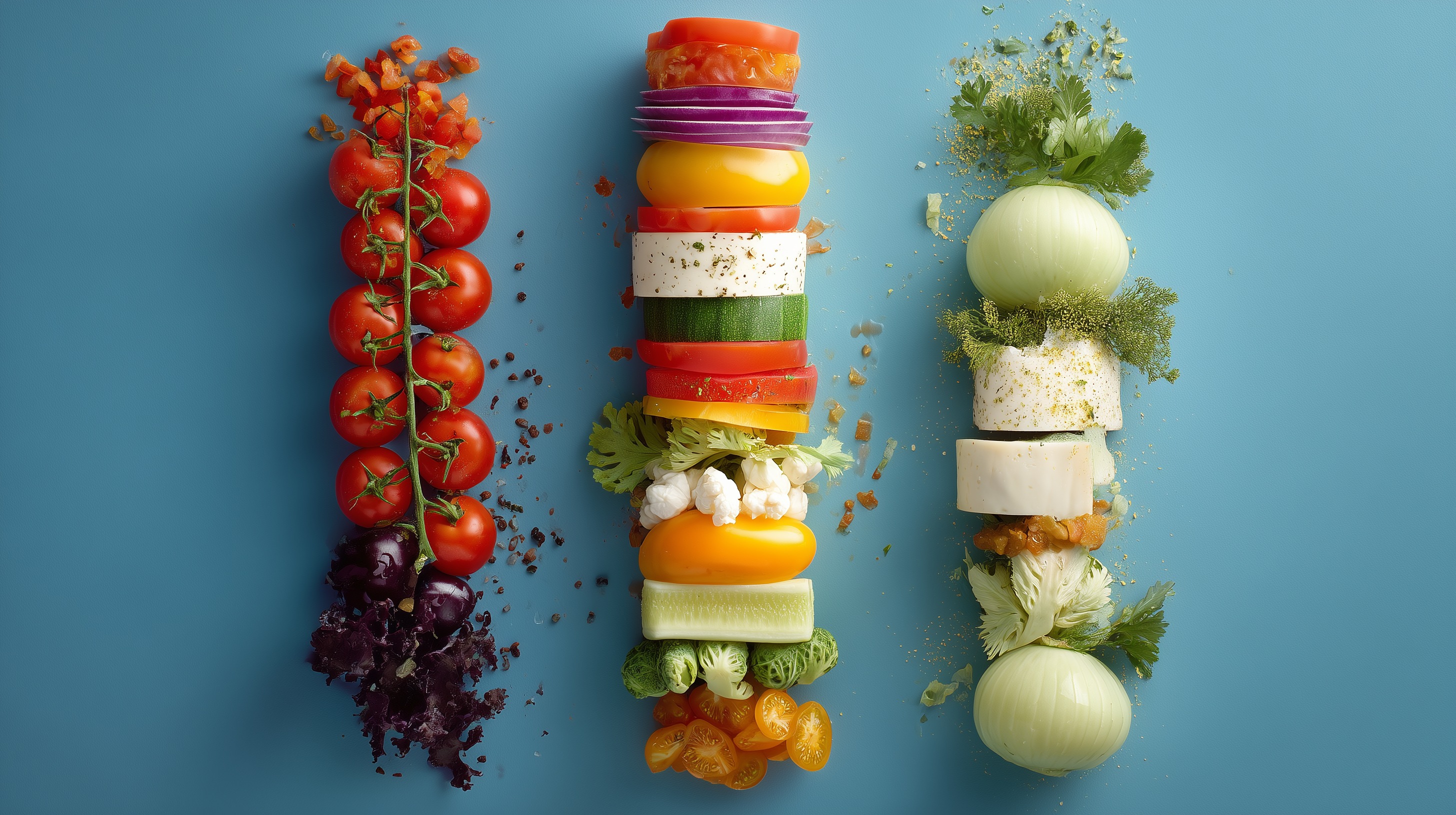 Dieses ausdrucksstarke Foto zeigt drei vertikale Gemüsearrangements auf einem hellblauen Hintergrund, fotografiert aus der Vogelperspektive. Die Komposition wirkt klar strukturiert und kreativ zugleich.