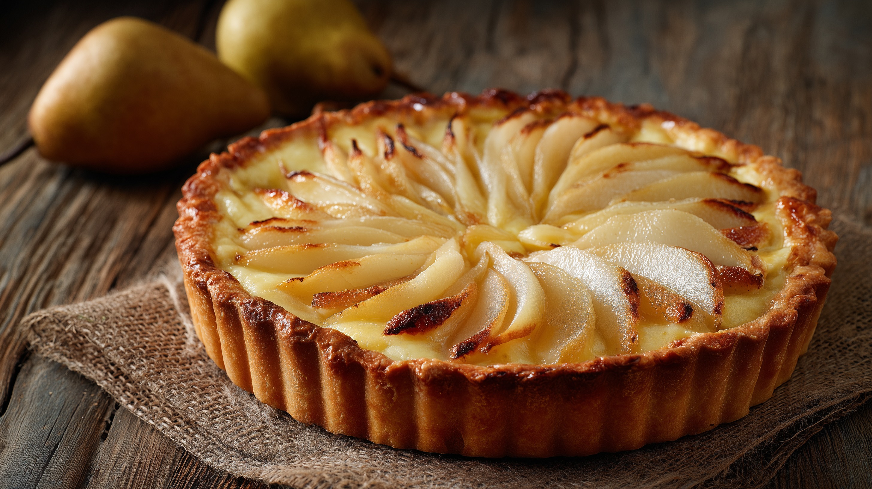 Die warme, goldene Farbpalette wird durch den rustikalen Holzuntergrund und ein natürliches Jute-Tuch harmonisch ergänzt. Im Hintergrund sind zwei ganze Birnen unscharf zu erkennen, was die Komposition natürlich und einladend wirken lässt. Das weiche Seitenlicht betont die Textur des Gebäcks und die karamellisierten Stellen der Birnen.