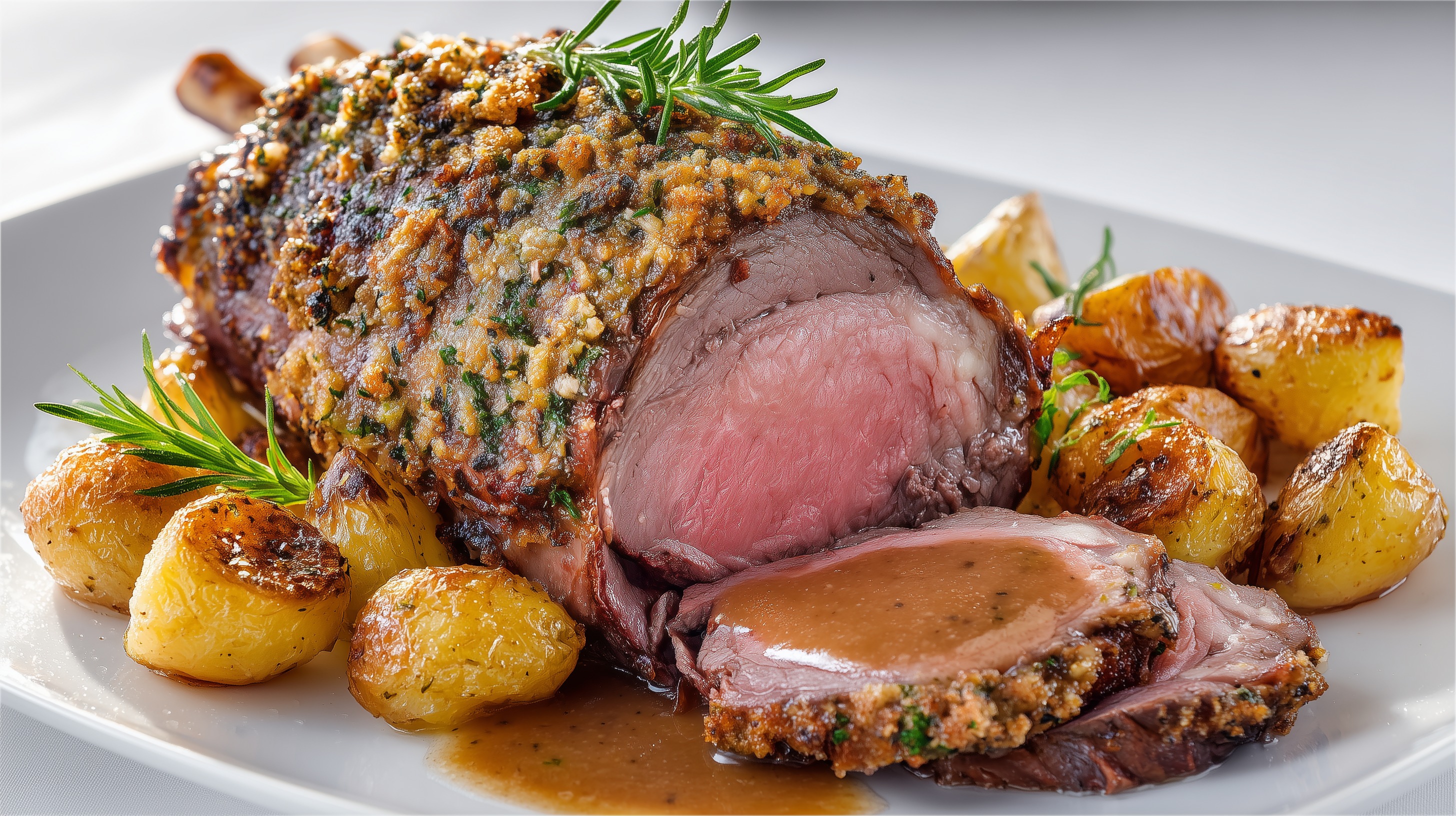 - Die Lammkeule tranchieren und mit den Bratkartoffeln und der Jus auf Tellern anrichten. Mit frischem Rosmarin garnieren.