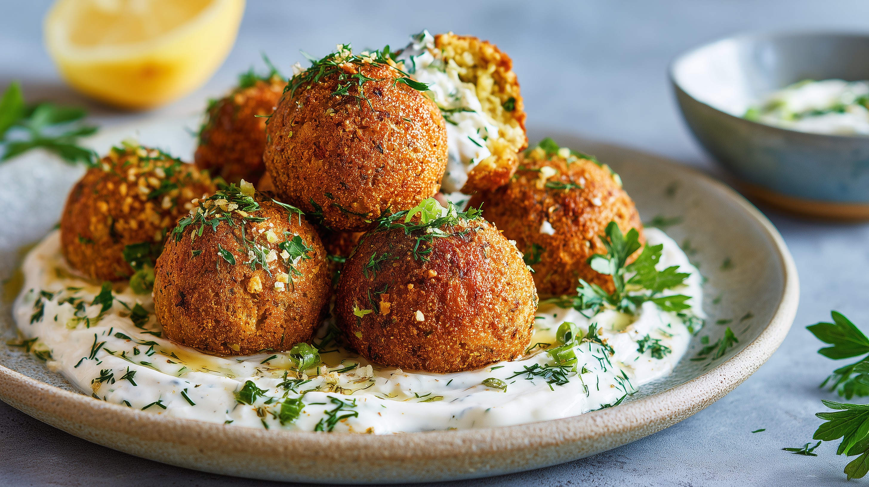 - Die fertigen Falafel auf Küchenpapier abtropfen lassen. Den Tzatziki auf einem Teller verteilen, die Falafel darauf anrichten, mit frischer Petersilie und einem Spritzer Zitronensaft servieren.