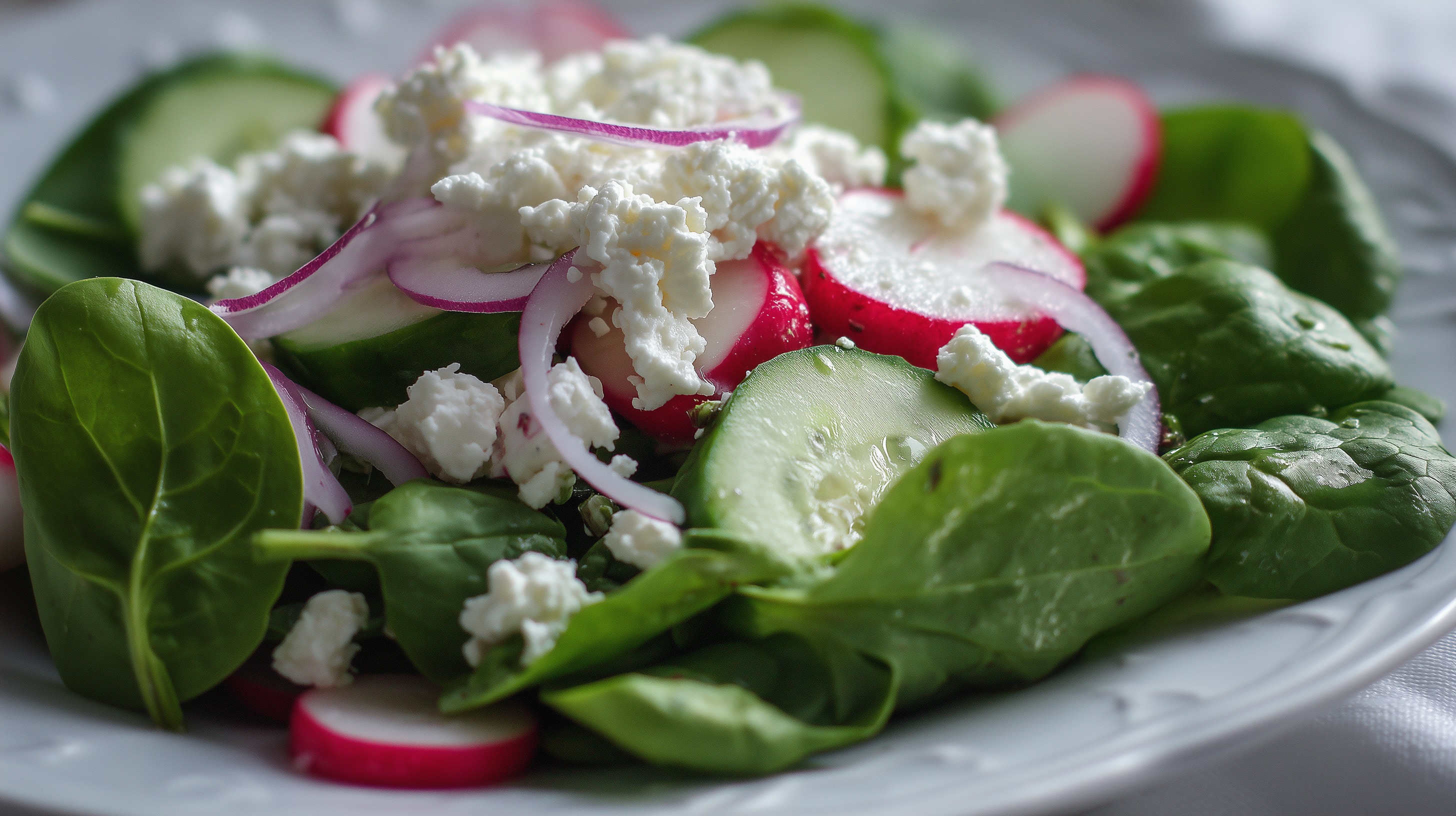 Dieses ansprechende Foto zeigt einen frisch angerichteten Spinatsalat mit Hüttenkäse, Radieschen, Gurkenscheiben und roten Zwiebelringen auf einem weißen Teller. Die saftigen, dunkelgrünen Blattspinat-Blätter bilden die Basis und werden von leuchtend roten Radieschenscheiben, hellgrünen Gurkenscheiben und zart-violetten Zwiebelringen ergänzt. Darüber verteilt sind cremeweißer, krümeliger Hüttenkäse, der dem Gericht eine frische Note und zusätzliches Eiweiß verleiht.