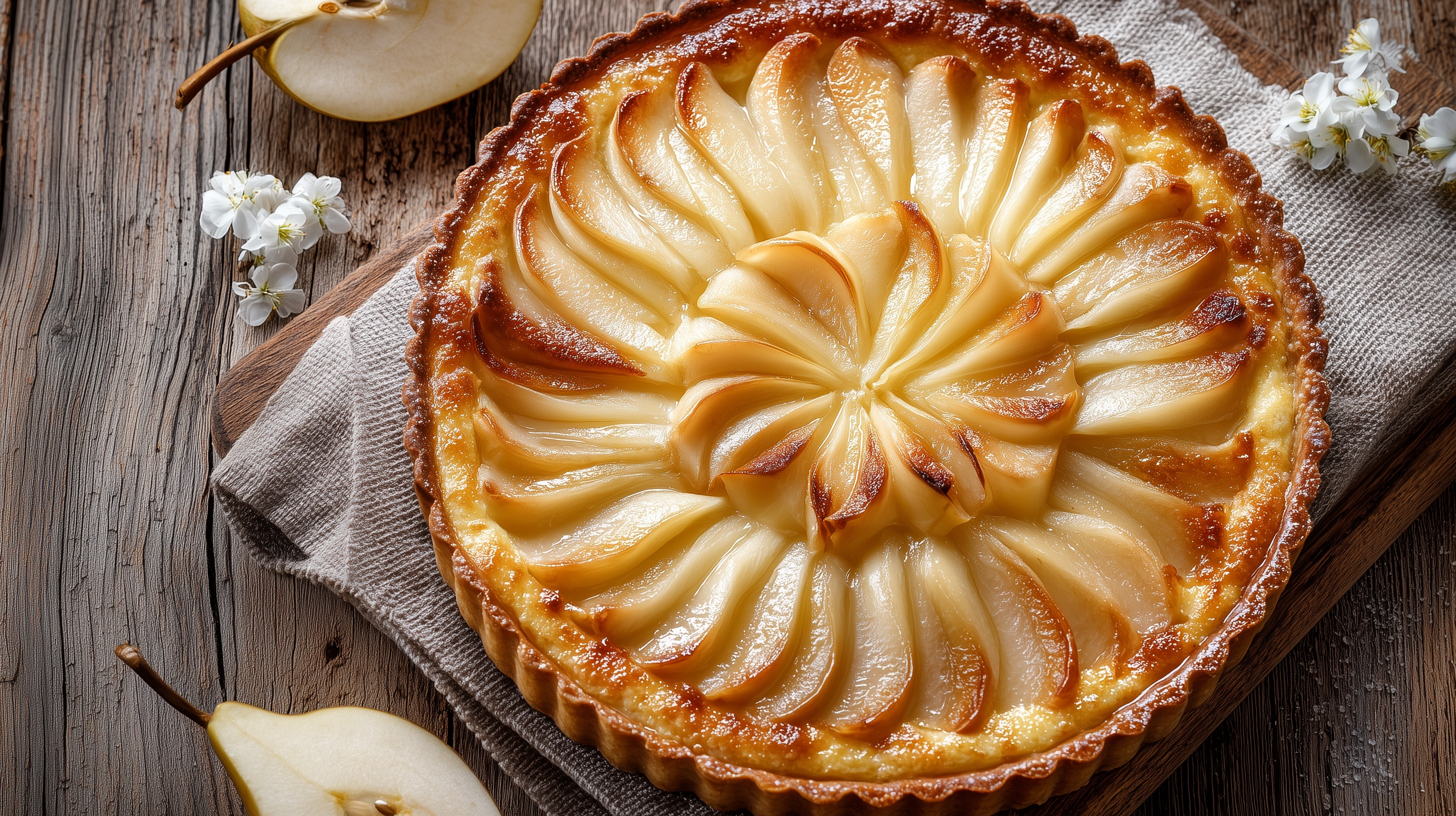 Diese Birnentarte zeigt dünn aufgefächerte Birnenscheiben, die in einem eleganten Blumen- und Spiralmuster auf dem goldbraun gebackenen Mürbeteig angeordnet sind. Die Tarte liegt auf einem gefalteten Leinentuch auf einem rustikalen Holzbrett vor einem verwitterten Holzhintergrund.