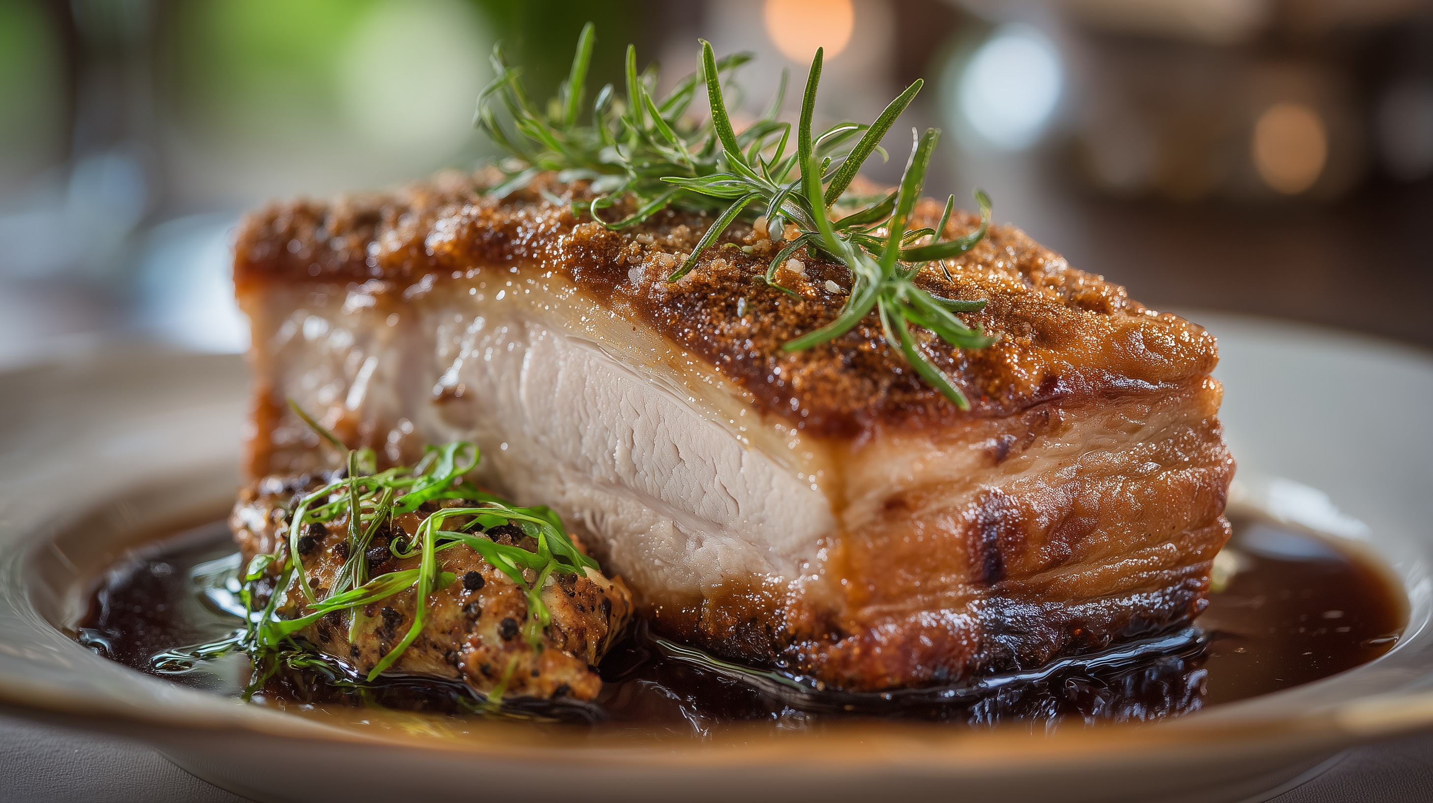 - Den Krustenbraten in Scheiben schneiden, mit der Biersauce anrichten und mit den restlichen frischen Rosmarinzweigen garnieren. Dazu passen Semmelknödel oder Kartoffelklöße sowie Sauerkraut oder Rotkohl.