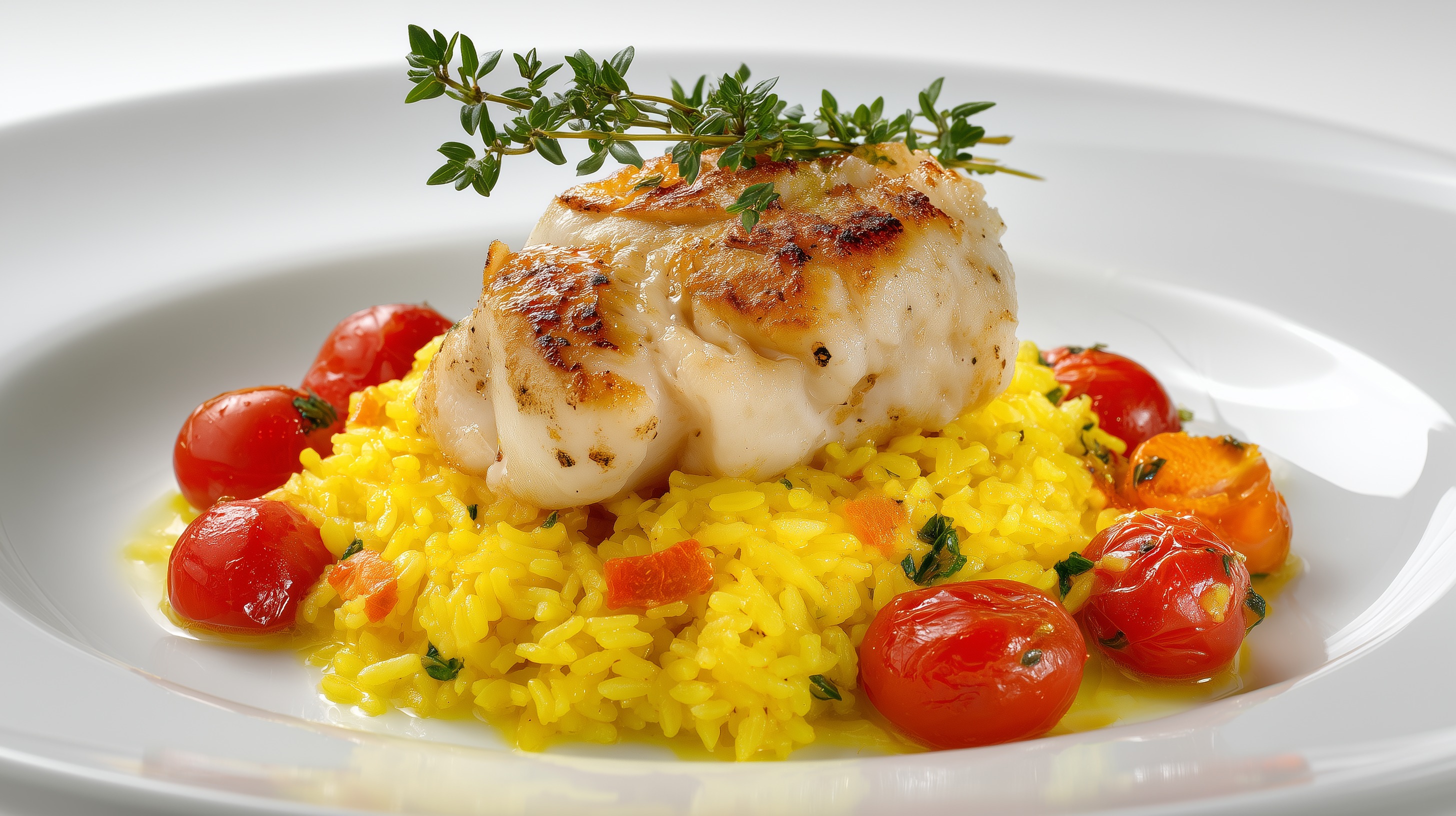 - Den fertigen Safranreis mit der gehackten Petersilie vermischen und abschmecken. Den Reis mittig auf vier vorgewärmte tiefe Teller verteilen, die gebratenen Kirschtomaten darum anordnen und das Seeteufelmedaillon obenauf setzen. Mit einem Thymianzweig garnieren und sofort servieren.