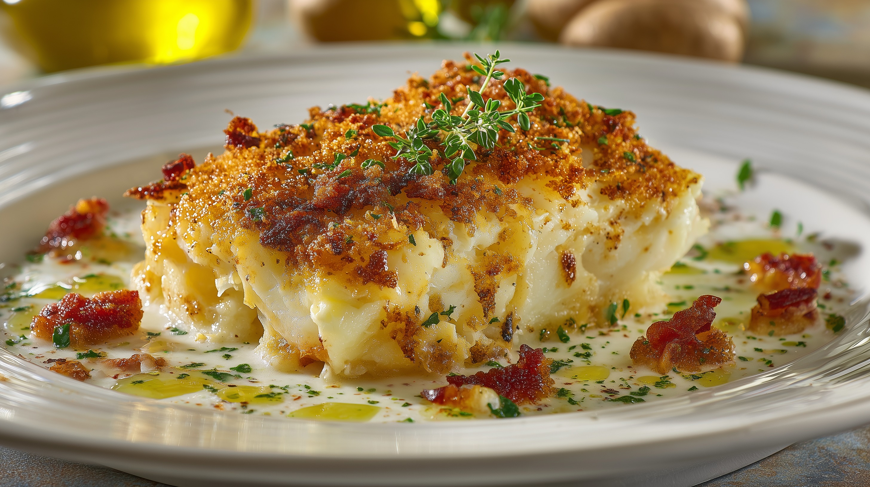 - Bacalhau-Mischung zusammenstellen: Den Bacalhau mit den Zwiebeln, dem Knoblauch und der Hälfte des Specks mischen. Die Kartoffelscheiben vorsichtig unterheben. Alles in eine gefettete Auflaufform (ca. 30 × 20 cm) geben und gleichmäßig verteilen. Die Sahnesauce darübergießen.