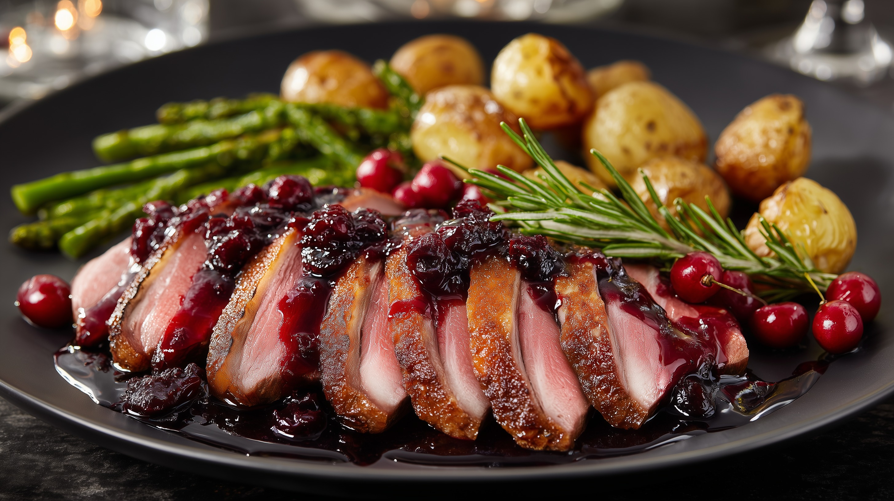 - Die Entenbrüste quer in Scheiben aufschneiden, auf vorgewärmten Tellern anrichten. Kirschsauce darüber geben, Rosmarinkartoffeln und Spargel daneben anrichten. Mit einem frischen Rosmarinzweig garnieren und sofort servieren.