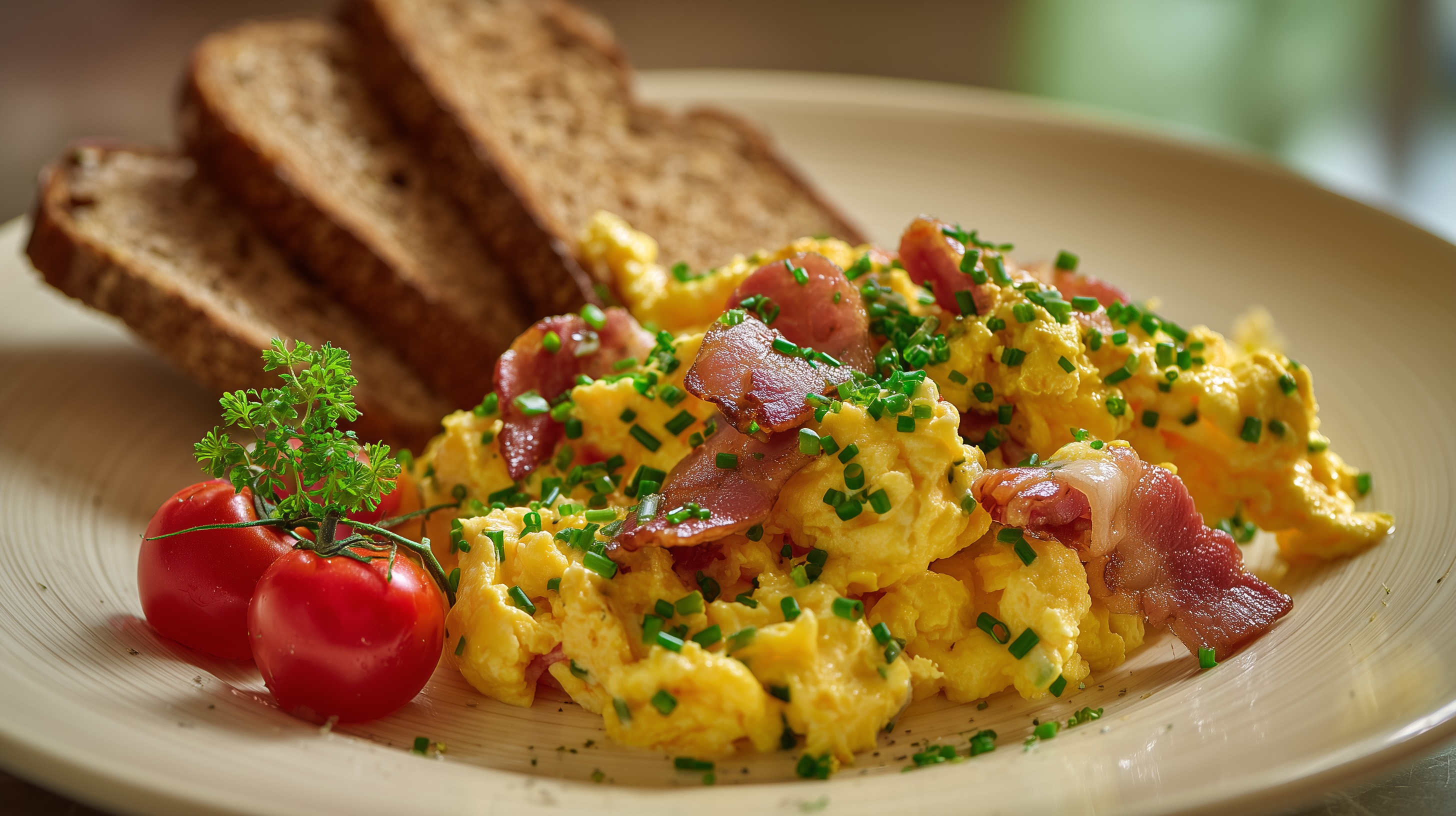 - Das Rührei auf vier Teller verteilen, großzügig mit frischem Schnittlauch bestreuen und mit Kirschtomaten sowie Petersilie garnieren. Sofort mit dem Toast servieren.
