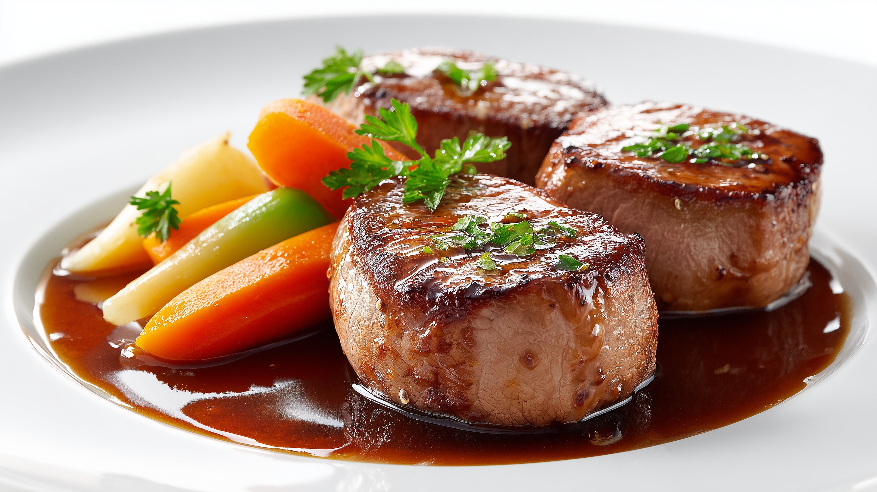 - Anrichten: Je zwei Medaillons pro Person auf einem vorgewärmten tiefen Teller anrichten. Das glacierte Gemüse daneben platzieren. Die Madeira Jus großzügig um das Fleisch gießen und mit frischer Petersilie garnieren. Sofort servieren.