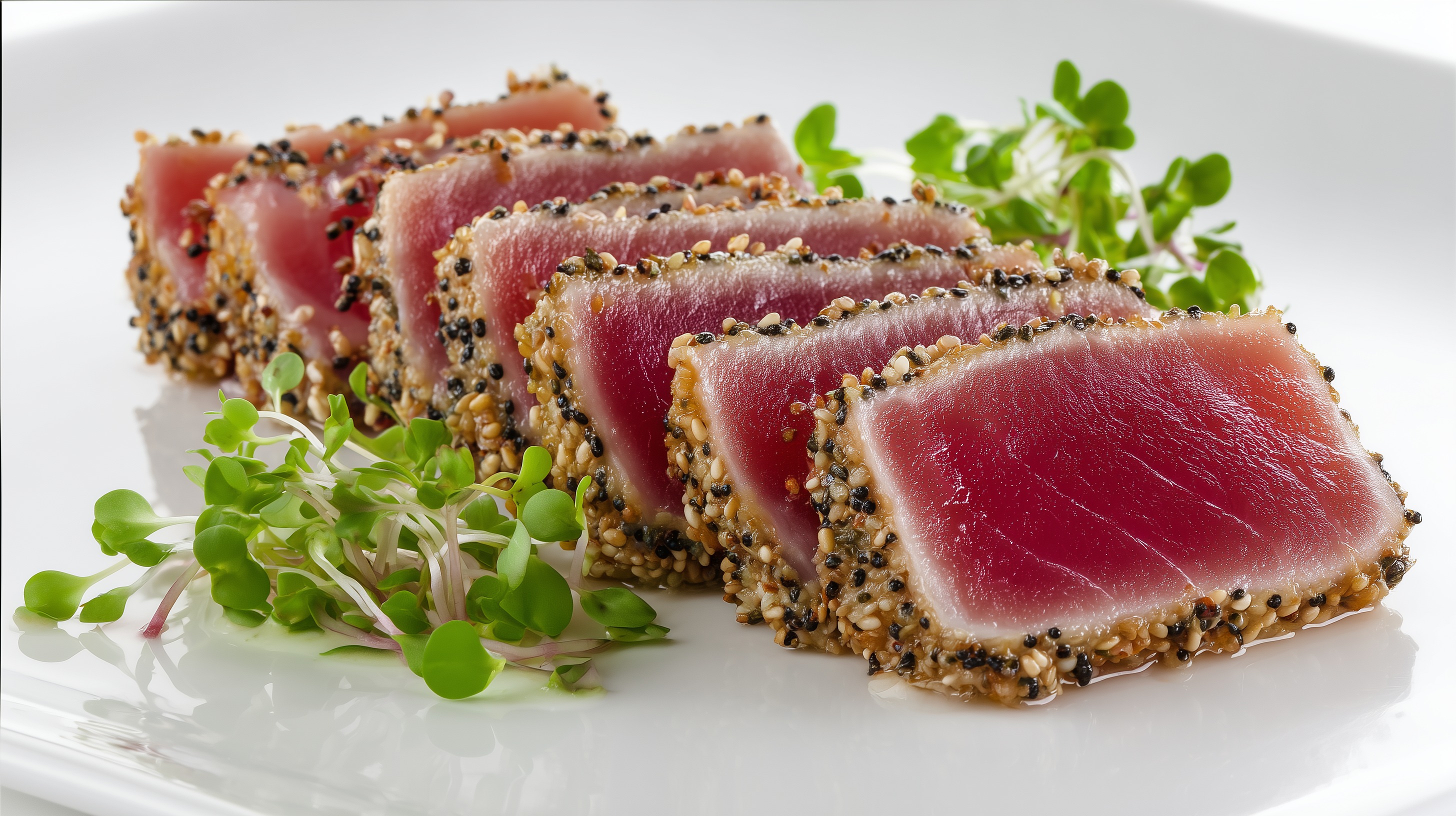 - Sesampanierung: Weiße und schwarze Sesamsamen auf einem flachen Teller vermengen. Die marinierten Thunfischsteaks von allen Seiten kräftig in die Sesamsamen drücken, sodass eine gleichmäßige, dichte Kruste entsteht.