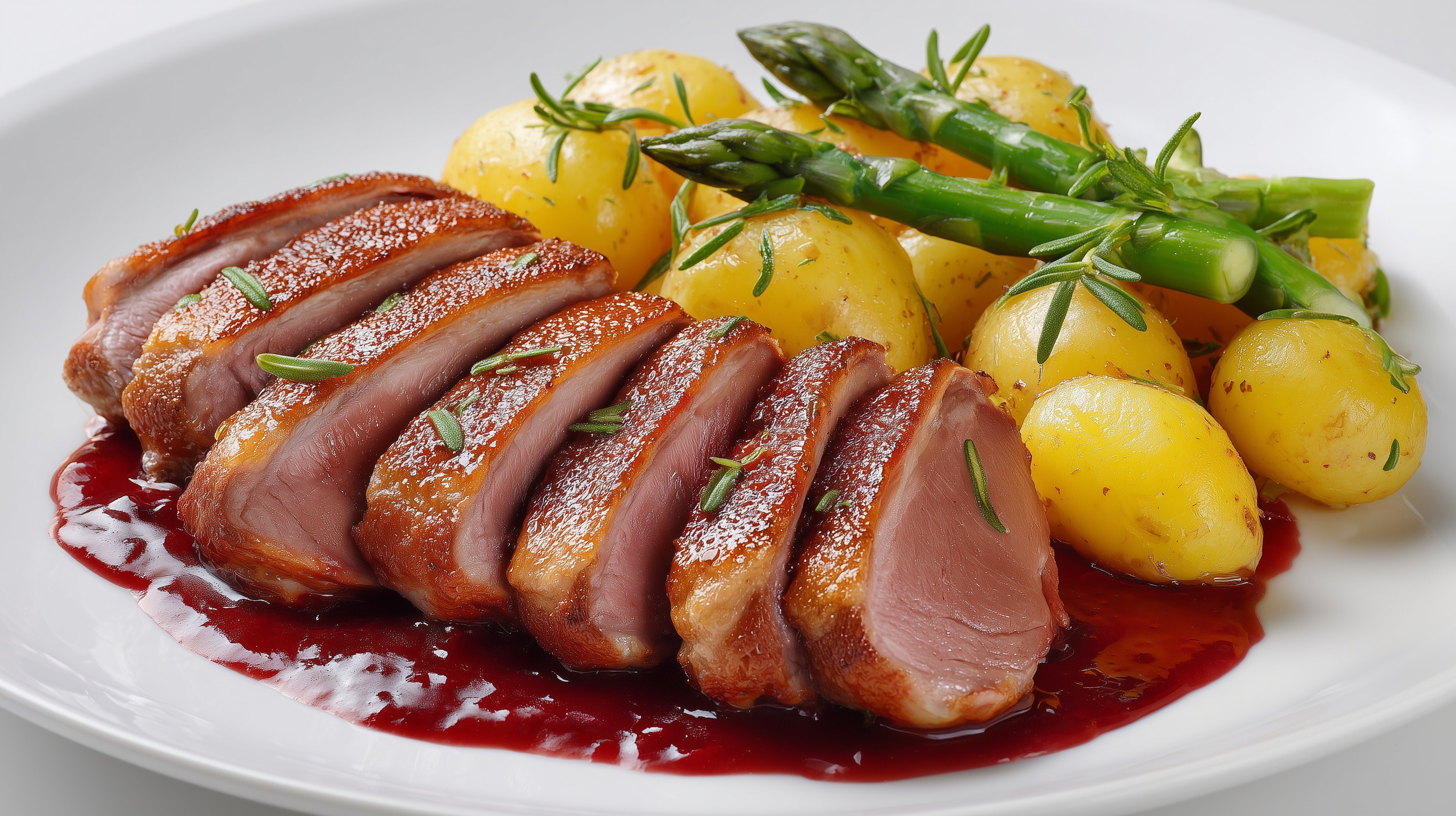 - Anrichten: Die Entenbrüste schräg in gleichmäßige Scheiben aufschneiden und auf vorgewärmten Tellern anrichten. Kirschsauce großzügig darunter verteilen. Rosmarinkartoffeln und Spargel als Beilage dazu servieren.