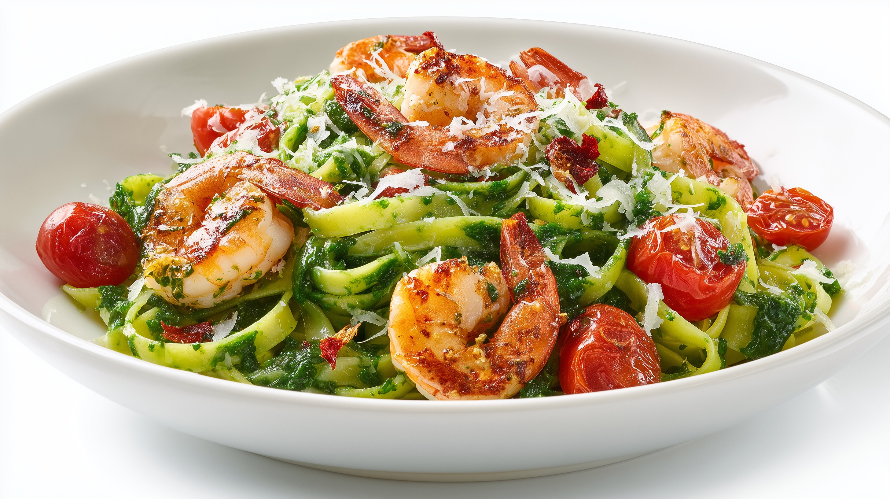 - Den restlichen gehackten Bärlauch unterheben und die Pasta auf vier tiefe Teller verteilen. Die Kirschtomaten und Garnelen darüber anrichten. Mit frisch geriebenem Parmesan bestreuen und sofort servieren.