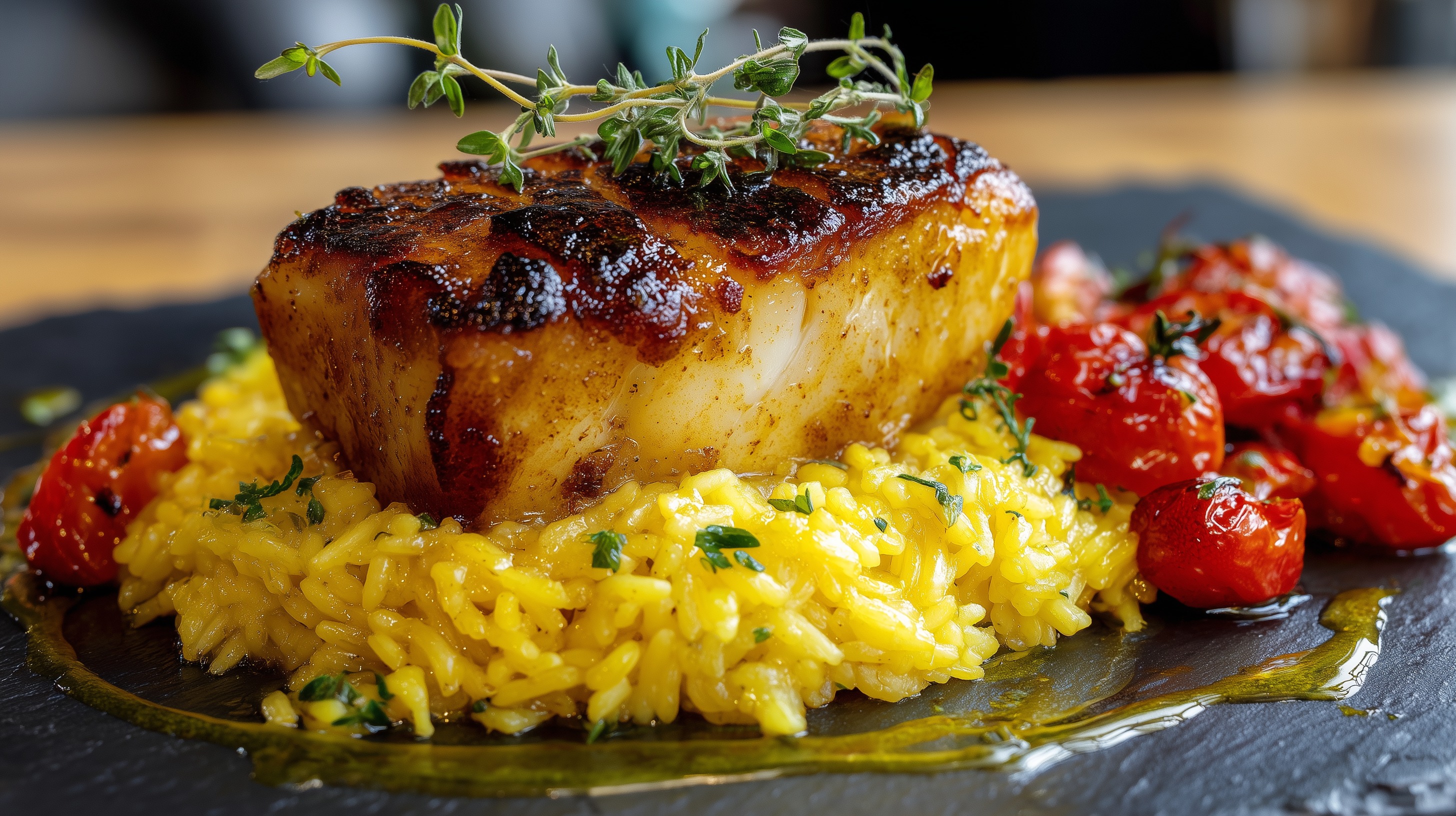 - Anrichten: Den Safranreis in der Mitte tiefer Teller oder auf Schieferplatten anrichten. Den Seeteufel auf dem Reis platzieren, die gerösteten Kirschtomaten danebenlegen und alles mit frischen Thymianzweigen garnieren. Nach Belieben mit etwas Olivenöl beträufeln und sofort servieren.
