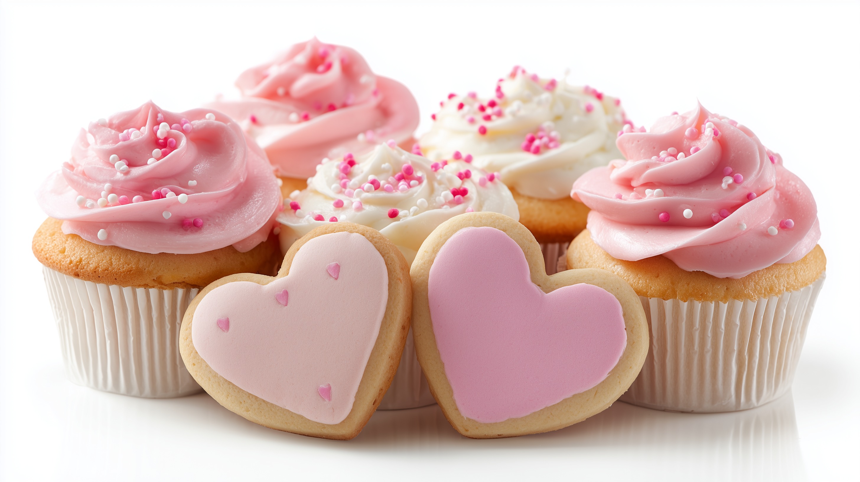 Dieses ansprechende Produktfoto zeigt eine Gruppe von Muttertag Cupcakes mit herzförmigen Keksen in einem zarten Rosa-Weiß-Farbschema. Die Cupcakes sind mit großzügigen Spiralen aus rosa und weißer Buttercreme dekoriert und mit bunten Zuckerstreuseln in Pink und Weiß verziert. Im Vordergrund liegen zwei herzförmige Kekse mit glänzendem Fondant-Überzug in hellem und kräftigem Rosa.