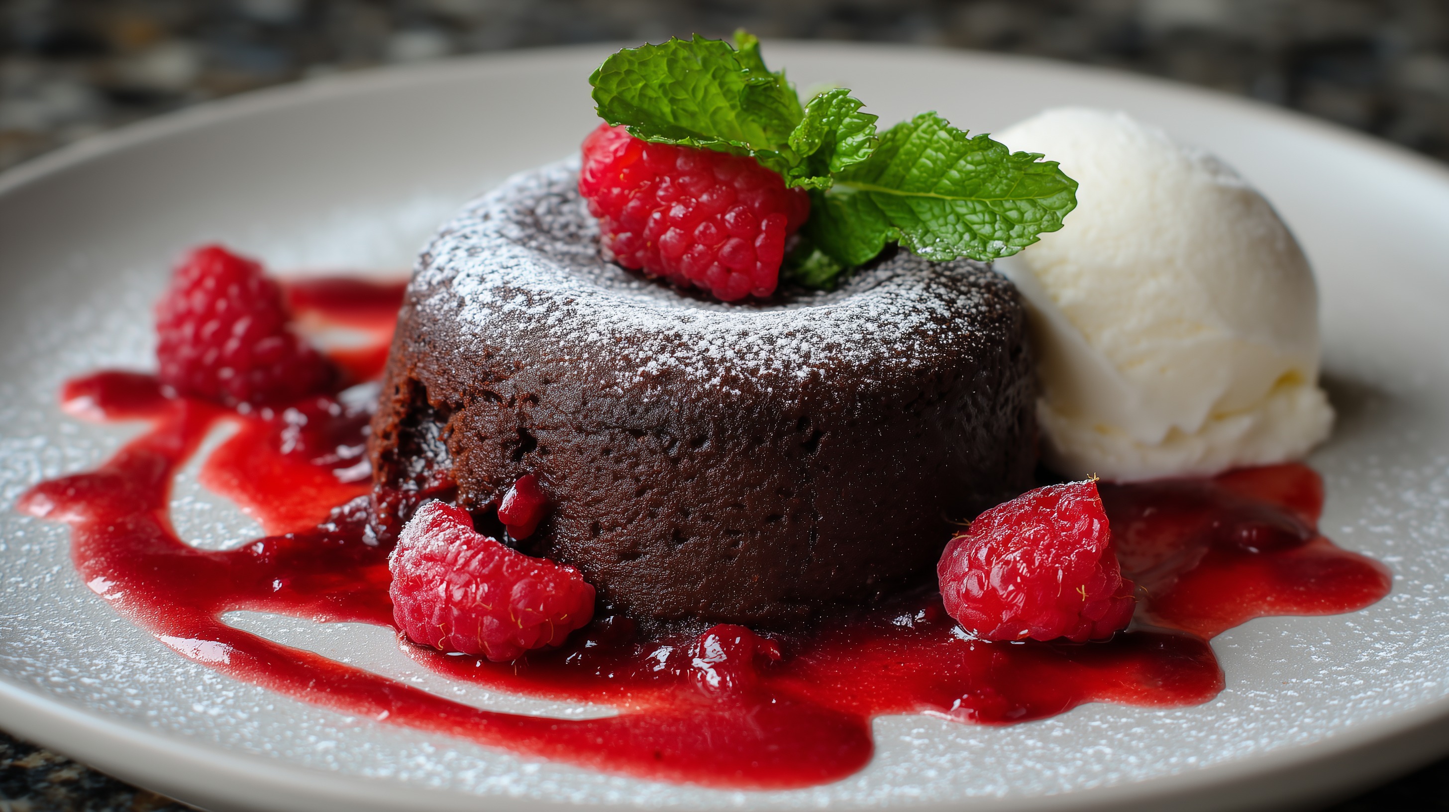 Dieses hochwertige Foodfoto zeigt einen klassischen Schokoladen Molten Cake auf einem schlichten weißen Teller. Der dunkelbraune Kuchen ist mit Puderzucker bestäubt und wird von einem leuchtend roten Himbeercoulis umgeben, in dem frische Himbeeren schwimmen. Oben auf dem Kuchen thronen eine Himbeere, eine Kugel cremiges Vanilleeis sowie ein frischer grüner Minzzweig als elegante Dekoration.