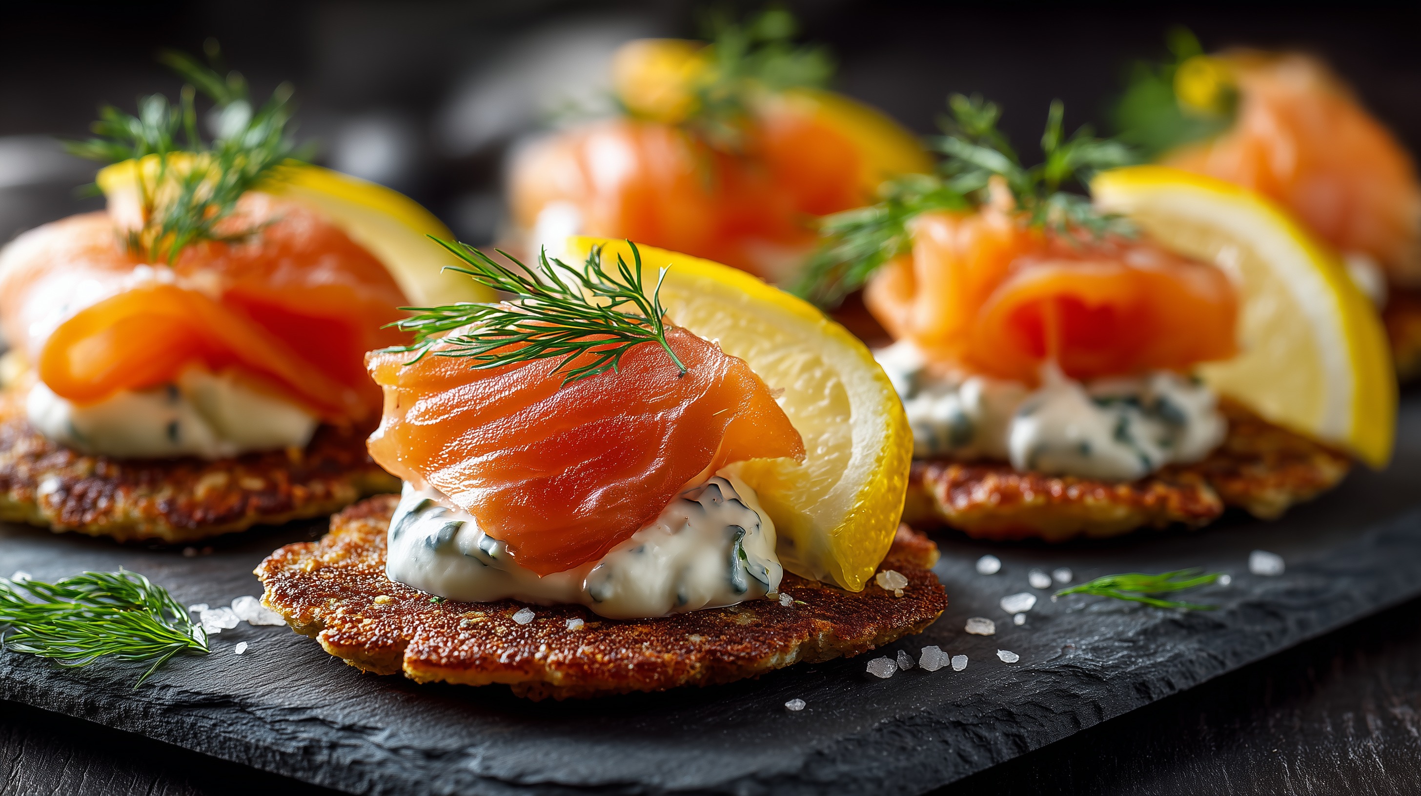 - Blinis auf einem Schieferbrett anrichten. Jeweils einen Klecks Dill-Crème-fraîche daraufgeben, eine Scheibe geräucherten Lachs locker darauflegen und mit einer Zitronenspalte sowie einem Dillzweig garnieren.
