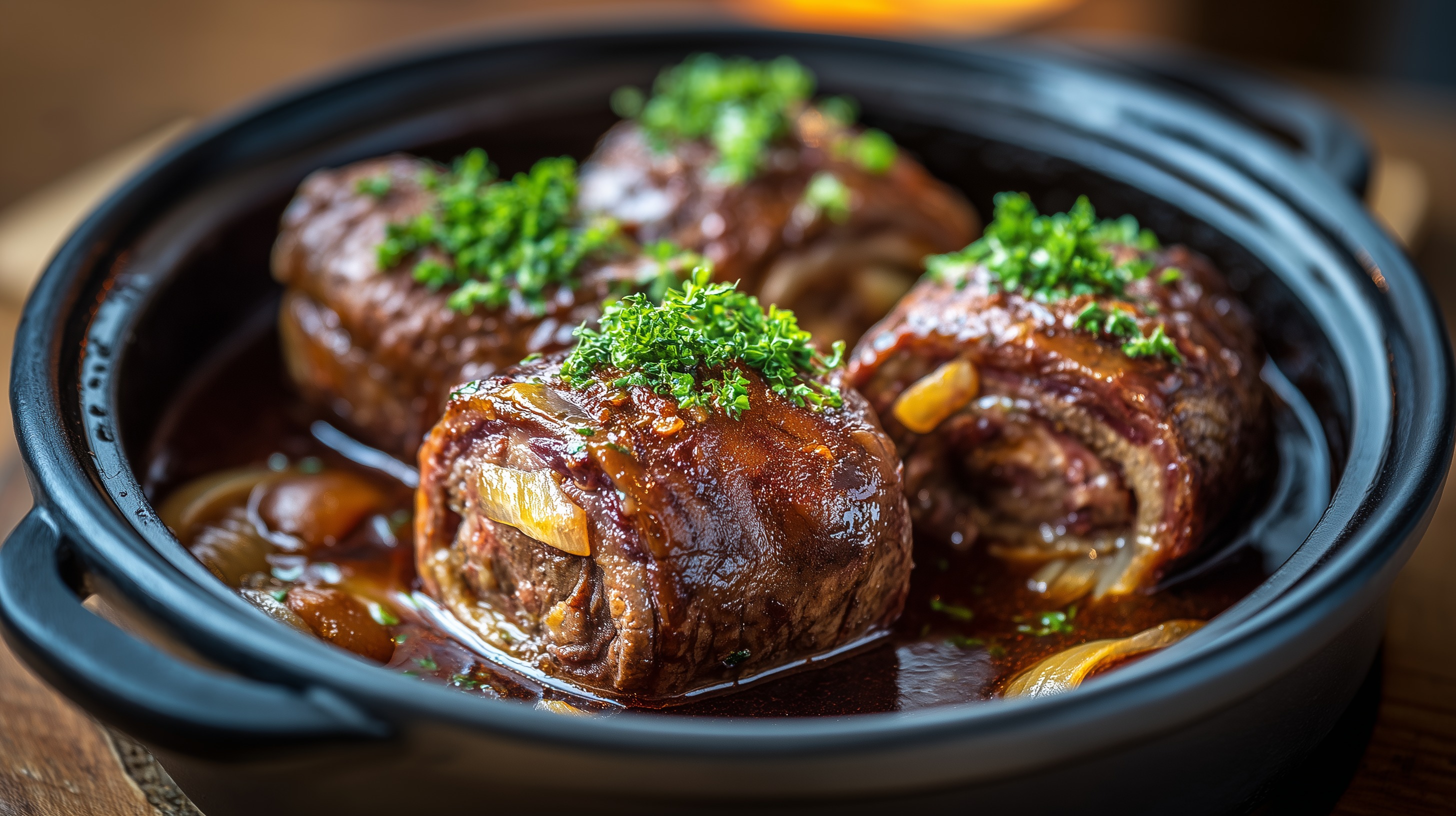 Tipp: Für eine besonders tiefe Sauce die Rouladen am Vortag zubereiten und über Nacht in der Sauce im Kühlschrank durchziehen lassen – aufgewärmt schmecken sie noch aromatischer. Wer keinen Alkohol verwenden möchte, kann den Rotwein durch zusätzlichen Rinderfond mit einem Schuss dunklem Traubensaft ersetzen.