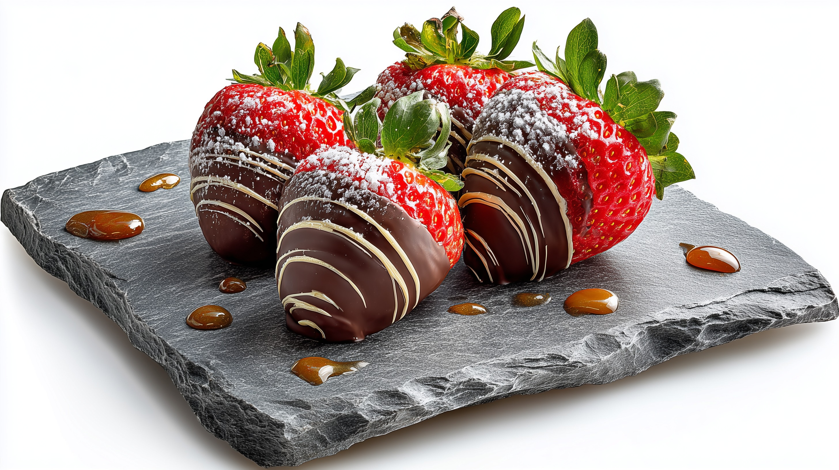 Dieses Stockfoto zeigt vier sorgfältig mit dunkler Schokolade überzogene Erdbeeren, die auf einer rustikalen Schieferplatte angerichtet sind. Die Früchte sind mit feinen weißen Schokoladenstreifen verziert und mit Puderzucker bestäubt, was ihnen ein edles Erscheinungsbild verleiht. Karamellspritzer auf dem Schiefer ergänzen die Komposition und verleihen ihr eine warme, goldene Note.