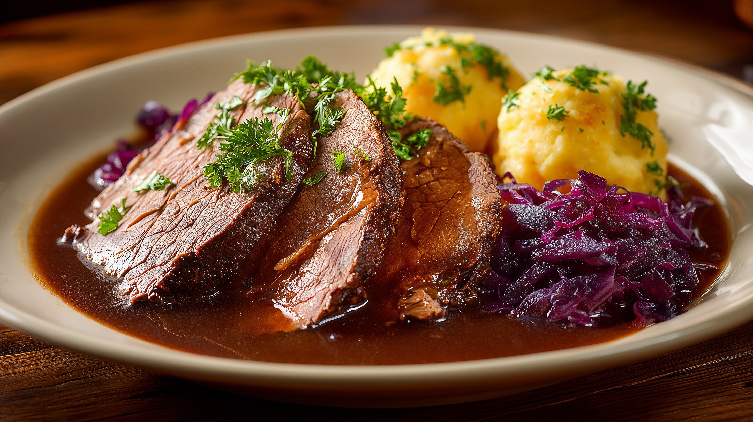 - Anrichten: Bratenscheiben mit der Soße auf vorgewärmten Tellern anrichten, Rotkohl und Klöße dazugeben und alles mit frischer Petersilie garnieren. Sofort servieren.