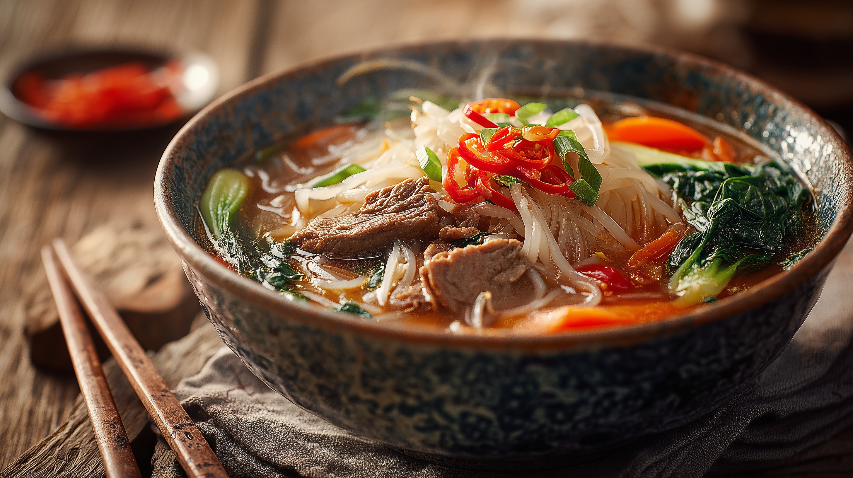 - Die eingeweichten Bihun-Nudeln und die Sojasprossen in die Suppe geben, kurz erwärmen und mit Salz und Pfeffer abschmecken.