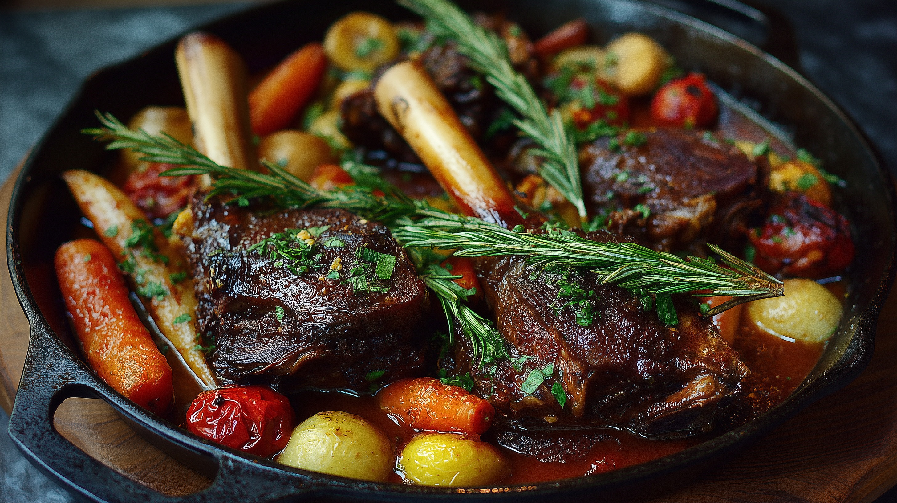 Diese Nahaufnahme zeigt saftige, dunkelbraun geschmorte Lammhaxen in einer großen schwarzen Gusseisenpfanne mit zwei Griffen, die auf einem Holzbrett ruht. Die Lammhaxen sind von einer glänzenden, kräftigen Soße umgeben und mit frischen Rosmarinzweigen sowie gehackter Petersilie garniert.