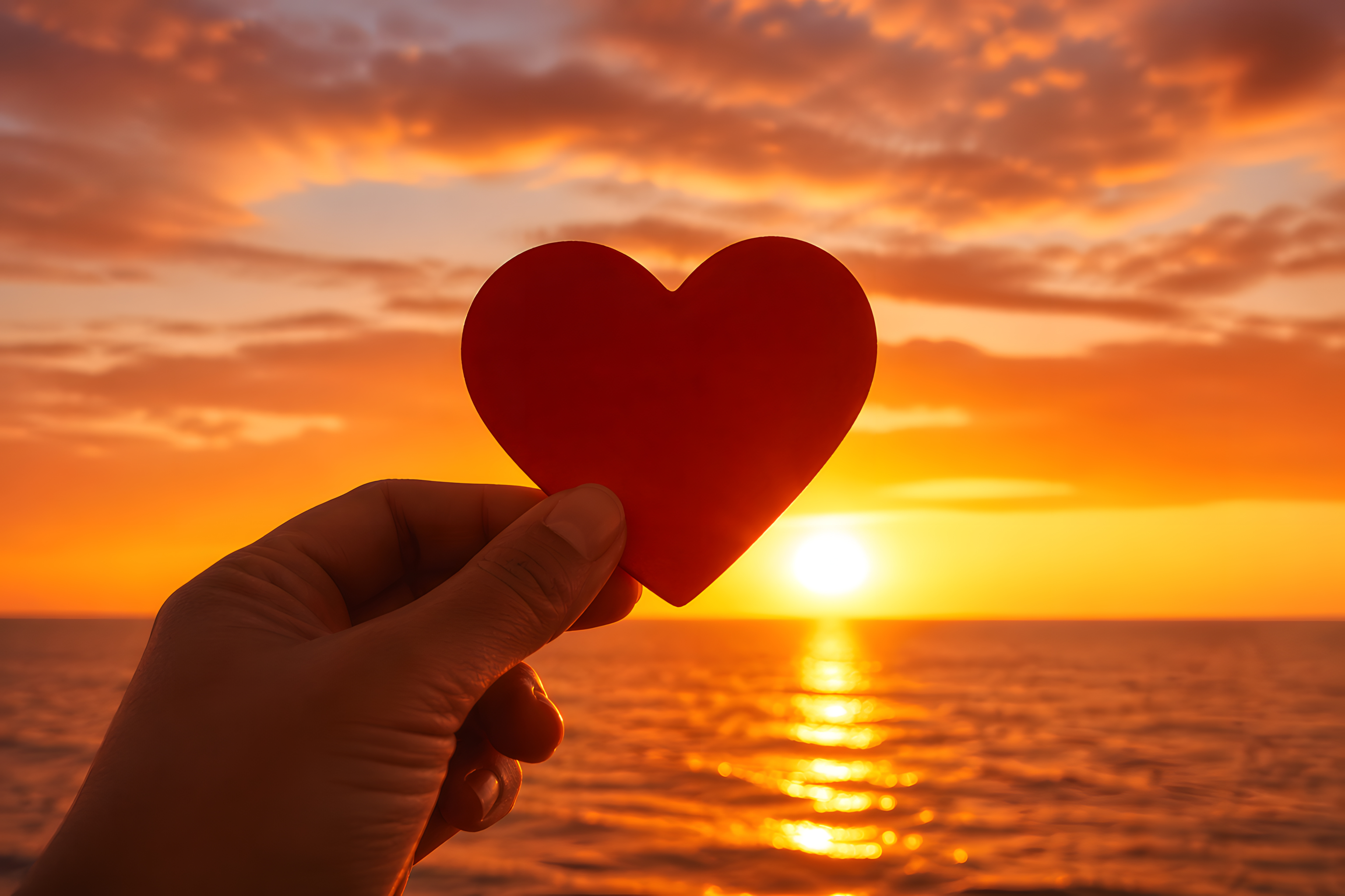 Dieses stimmungsvolle Foto zeigt eine Hand, die ein rotes Herz aus Papier oder Karton in Richtung des Himmels hält. Im Hintergrund geht die Sonne über dem Meer unter und taucht die gesamte Szenerie in warme Orange- und Goldtöne. Die Sonnenscheibe spiegelt sich auf der ruhigen Wasseroberfläche und erzeugt einen leuchtenden Lichtstreifen. Dramatische Wolken ziehen sich über den Abendhimmel und verleihen dem Bild eine romantische, fast malerische Tiefe.