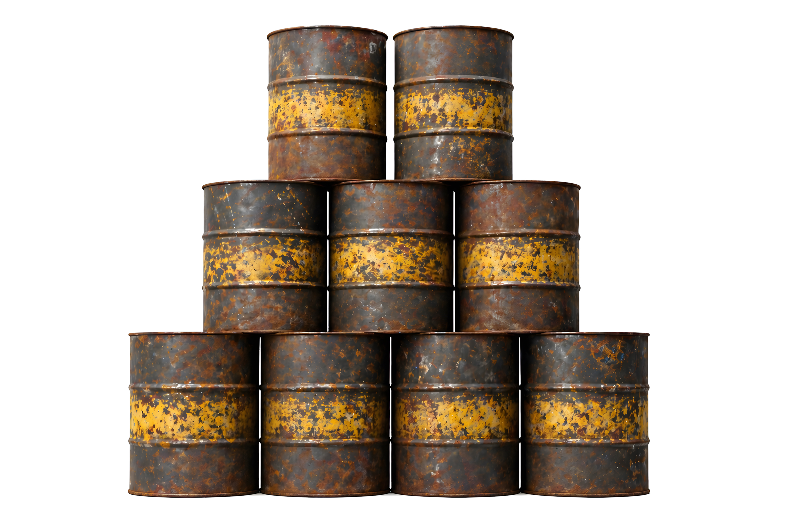Das Foto zeigt neun verrostete Metallfässer, die in einer klassischen Pyramidenanordnung aufeinandergestapelt sind: vier Fässer in der untersten Reihe, drei in der mittleren und zwei an der Spitze. Die Aufnahme erfolgt frontal auf weißem Hintergrund, was die Fässer klar freigestellt und besonders prägnant wirken lässt.