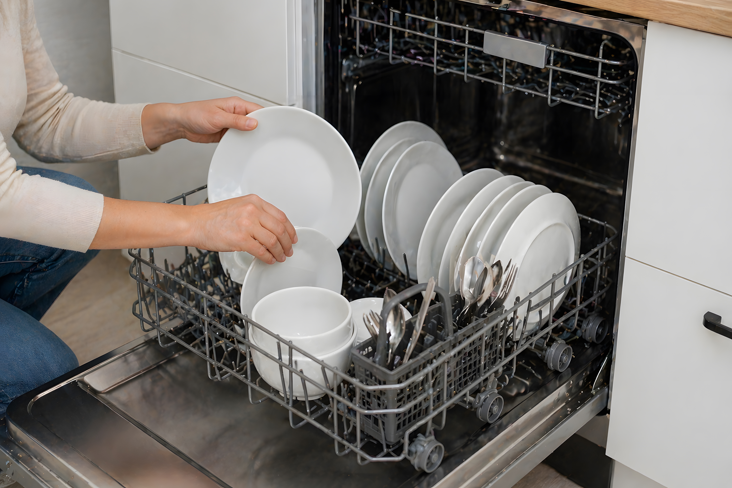 Dieses Foto zeigt eine Frau, die Teller in die geöffnete Spülmaschine einräumt. Zu sehen sind ihre Hände, die zwei weiße Teller halten und in den unteren Geschirrkorb der Maschine platzieren. Der Korb ist bereits gut gefüllt mit mehreren weißen Tellern unterschiedlicher Größe, weißen Schüsseln sowie Besteck aus Edelstahl.