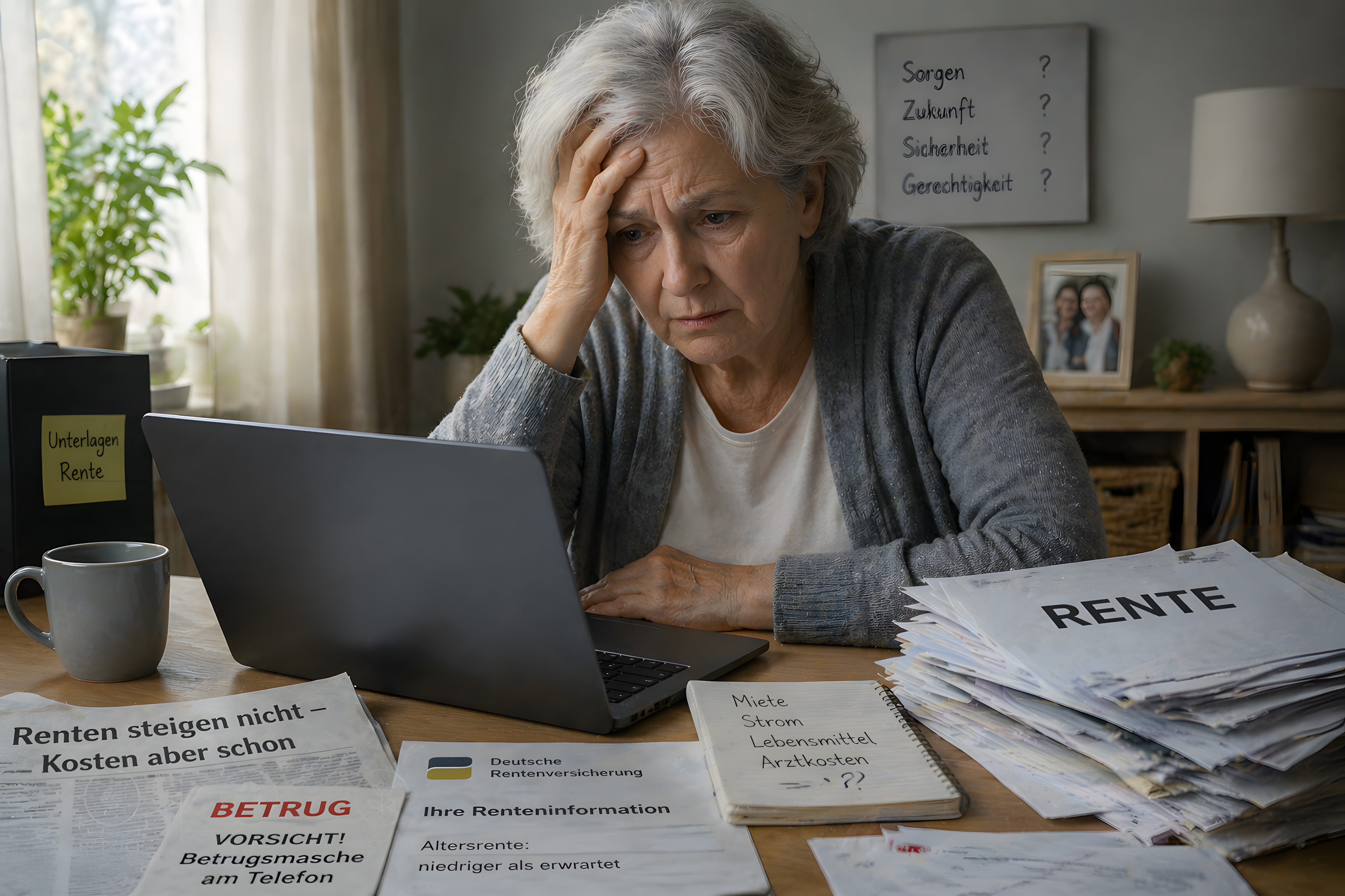 Das Foto zeigt eine ältere Frau mit grauem Haar, die sichtlich besorgt an einem Holztisch sitzt und auf einen aufgeklappten Laptop schaut. Sie stützt den Kopf mit einer Hand ab, was ihre Erschöpfung und Verzweiflung unterstreicht. Auf dem Tisch liegen zahlreiche Dokumente, darunter ein Schreiben der Deutschen Rentenversicherung mit dem Hinweis auf eine niedrigere Altersrente als erwartet, Zeitungsausschnitte mit Überschriften wie «Renten steigen nicht – Kosten aber schon» sowie Warnhinweise zu Telefonbetrug. Ein Notizbuch zeigt handschriftlich aufgelistete Ausgaben wie Miete, Strom, Lebensmittel und Arztkosten.