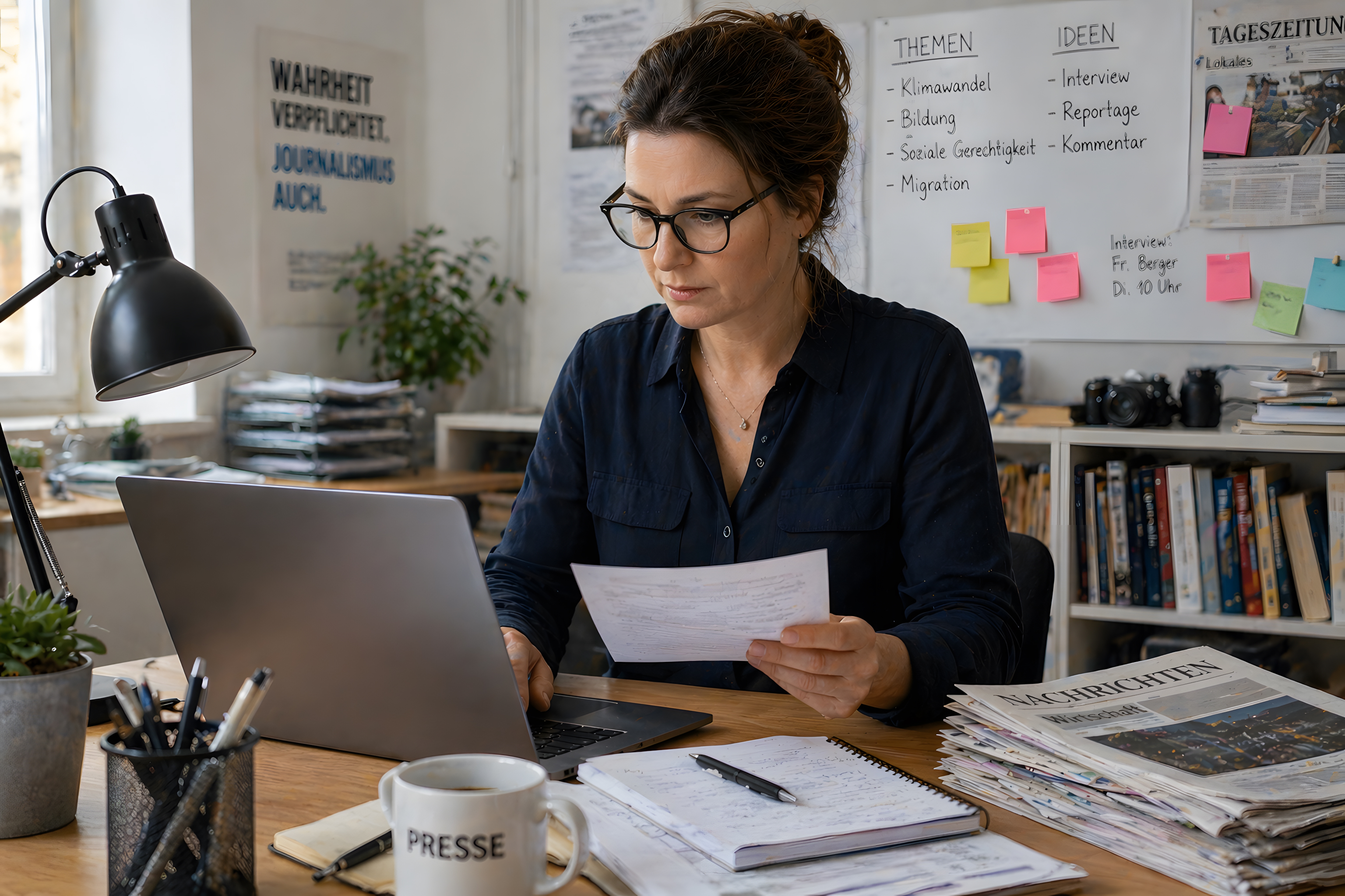 Das Foto zeigt eine Frau mittleren Alters mit dunklem Haar und schwarzer Brille, die konzentriert an einem vollbepackten Schreibtisch in einer Redaktion sitzt. Sie trägt ein dunkelblaues Hemd und hält ein beschriebenes Dokument in der Hand, während sie gleichzeitig auf einem Laptop arbeitet. Auf dem Schreibtisch befinden sich Notizbücher, ein Stiftehalter, eine Kaffeetasse mit der Aufschrift «Presse» sowie ein Stapel Tageszeitungen mit der Schlagzeile «Nachrichten».