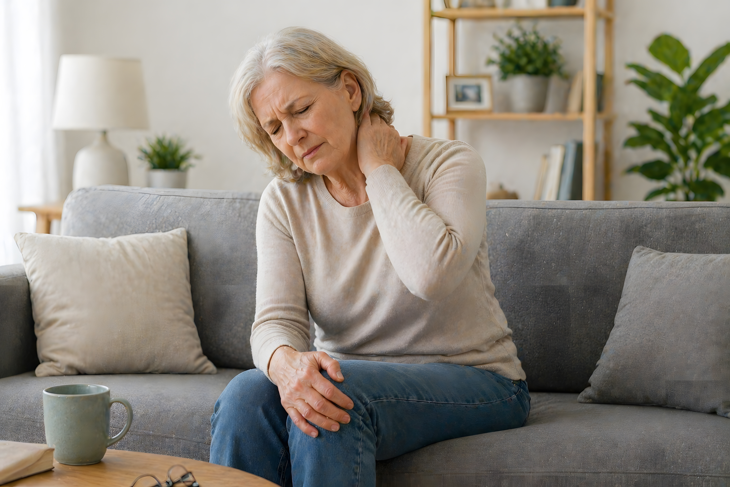 Das Foto zeigt eine ältere Frau mit grauen Haaren, die auf einem grauen Sofa in einem hellen Wohnzimmer sitzt und sich mit einer Hand den Nacken hält. Ihr Gesichtsausdruck vermittelt deutlich Schmerz und Unwohlsein. Sie trägt einen beigen Langarmpullover und blaue Jeans. Die andere Hand ruht auf ihrem Knie.
