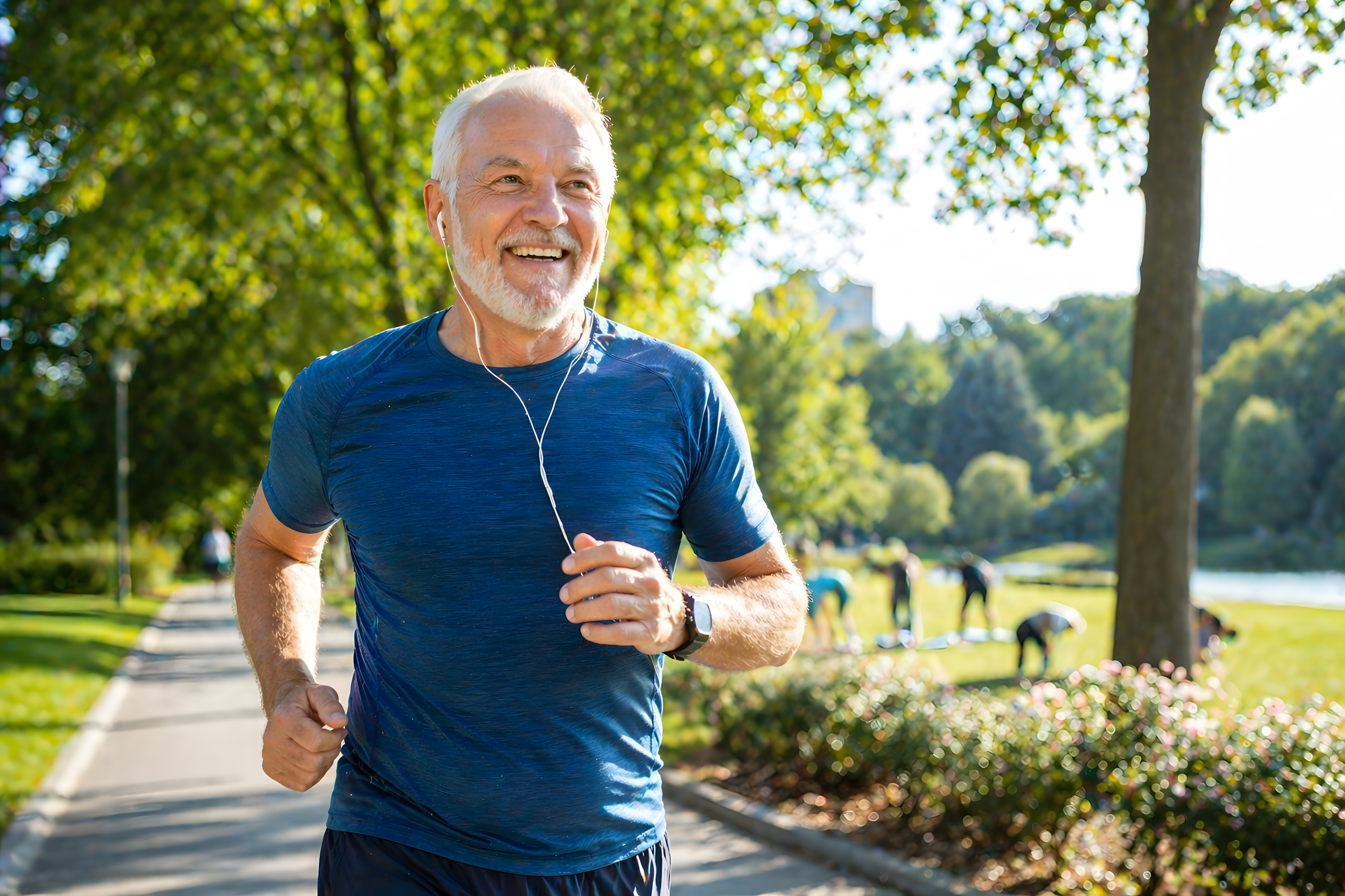 Das Foto zeigt einen älteren, sportlich gekleideten Mann beim Joggen in einem grünen Stadtpark. Er trägt ein blaues Funktionsshirt, dunkle Sporthose, eine Smartwatch am Handgelenk und weiße Ohrstöpsel. Sein weißes Haar und der gepflegte Bart unterstreichen sein reifes Erscheinungsbild, während sein breites Lächeln Freude und Lebensqualität ausstrahlt.