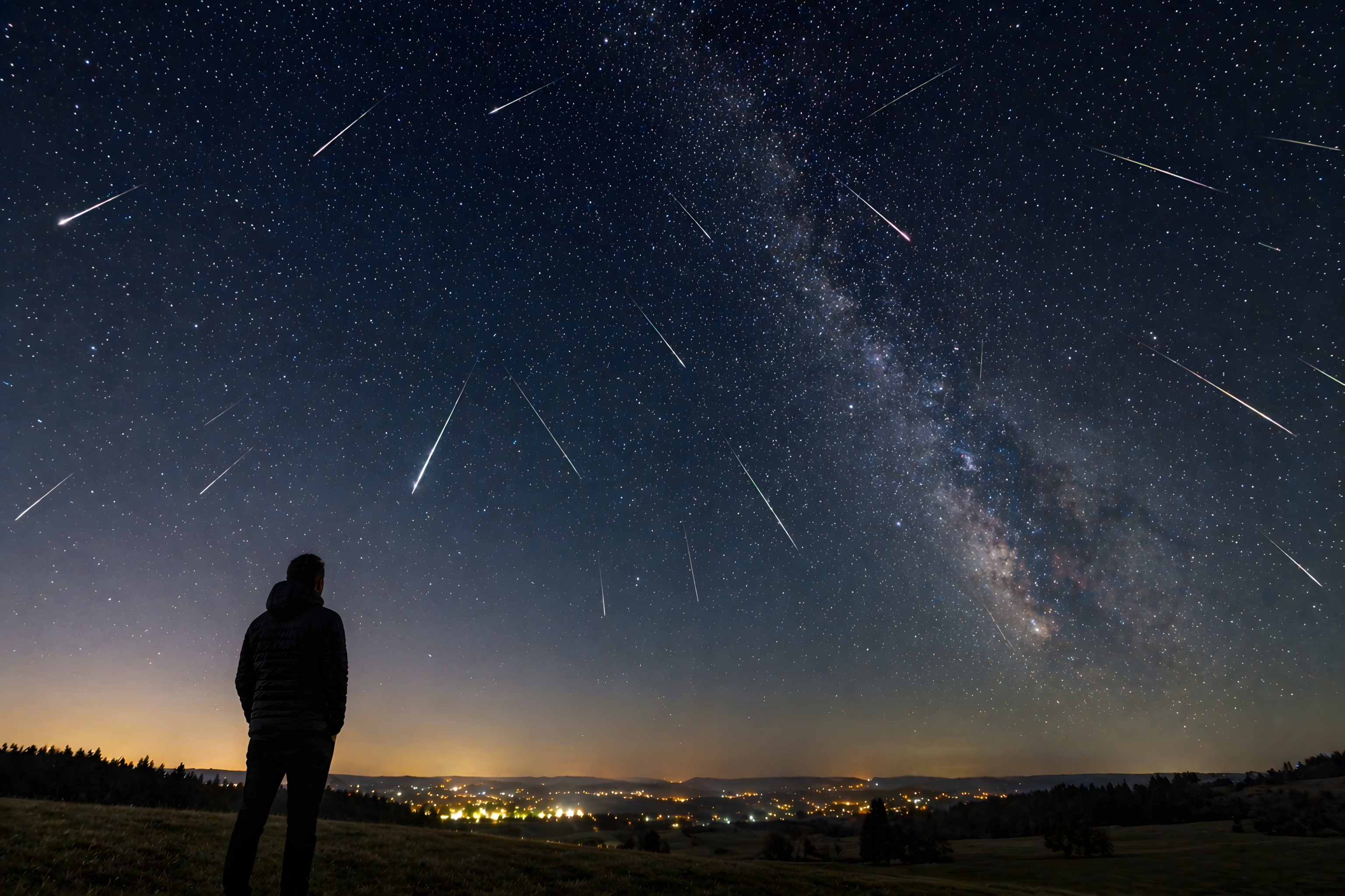 Im Vordergrund erstreckt sich eine sanfte Hügellandschaft mit Baumsilhouetten, im Tal leuchten die warmen Lichter einer Stadt. Diese Kombination aus warmen Erdtönen unten und dem kühlen Sternenhimmel oben erzeugt eine kraftvolle Bildkomposition. Die Aufnahme wurde durch Langzeitbelichtung realisiert, wodurch sowohl die Meteorbahnen als auch die Sternenstruktur der Milchstraße sauber eingefangen wurden.