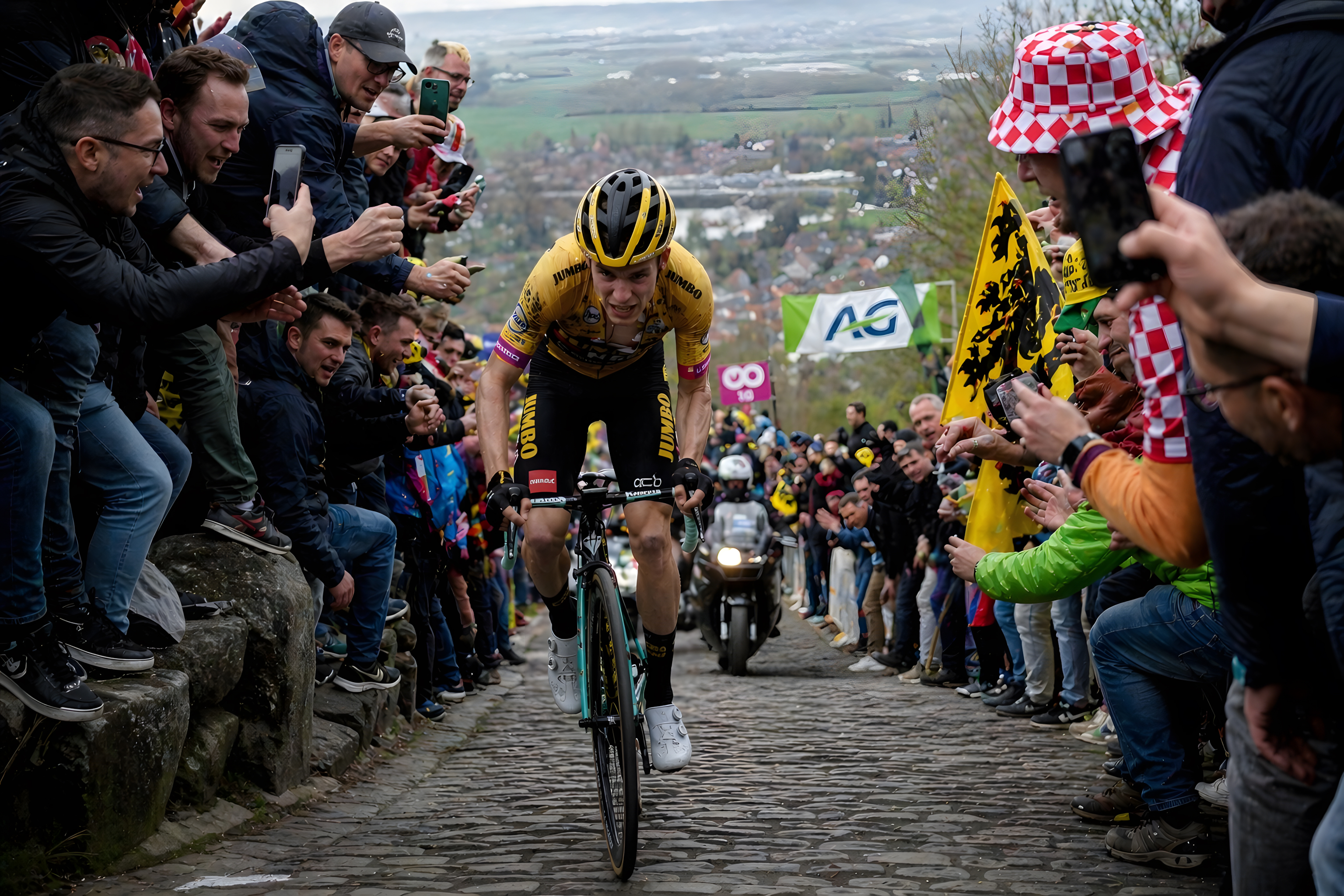 Beidseitig säumen hunderte begeisterte Zuschauer den engen Aufstieg, viele halten Smartphones in die Höhe, um den Moment festzuhalten. Auf der rechten Seite sind charakteristische Löwenflaggen Flanderns sowie eine kroatische Fahne zu erkennen, was auf einen bedeutenden Frühjahrsklassiker in Belgien hindeutet. Im Hintergrund öffnet sich eine weite Landschaft mit einem Ortschaft und grünen Feldern.